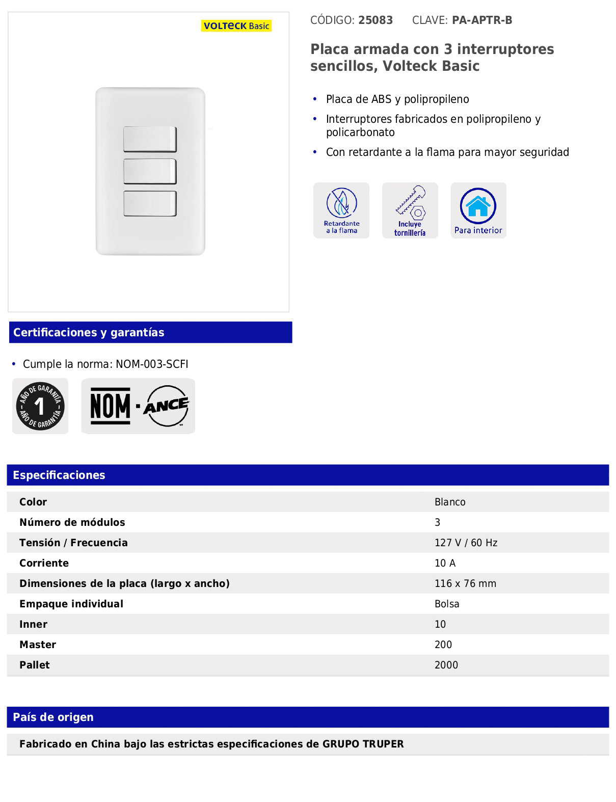 Esta placa armada está diseñada para instalaciones eléctricas interiores que requieren control independiente de tres circuitos desde un solo punto. Su configuración de tres interruptores sencillos permite una operación práctica y ordenada en espacios residenciales o comerciales ligeros.
