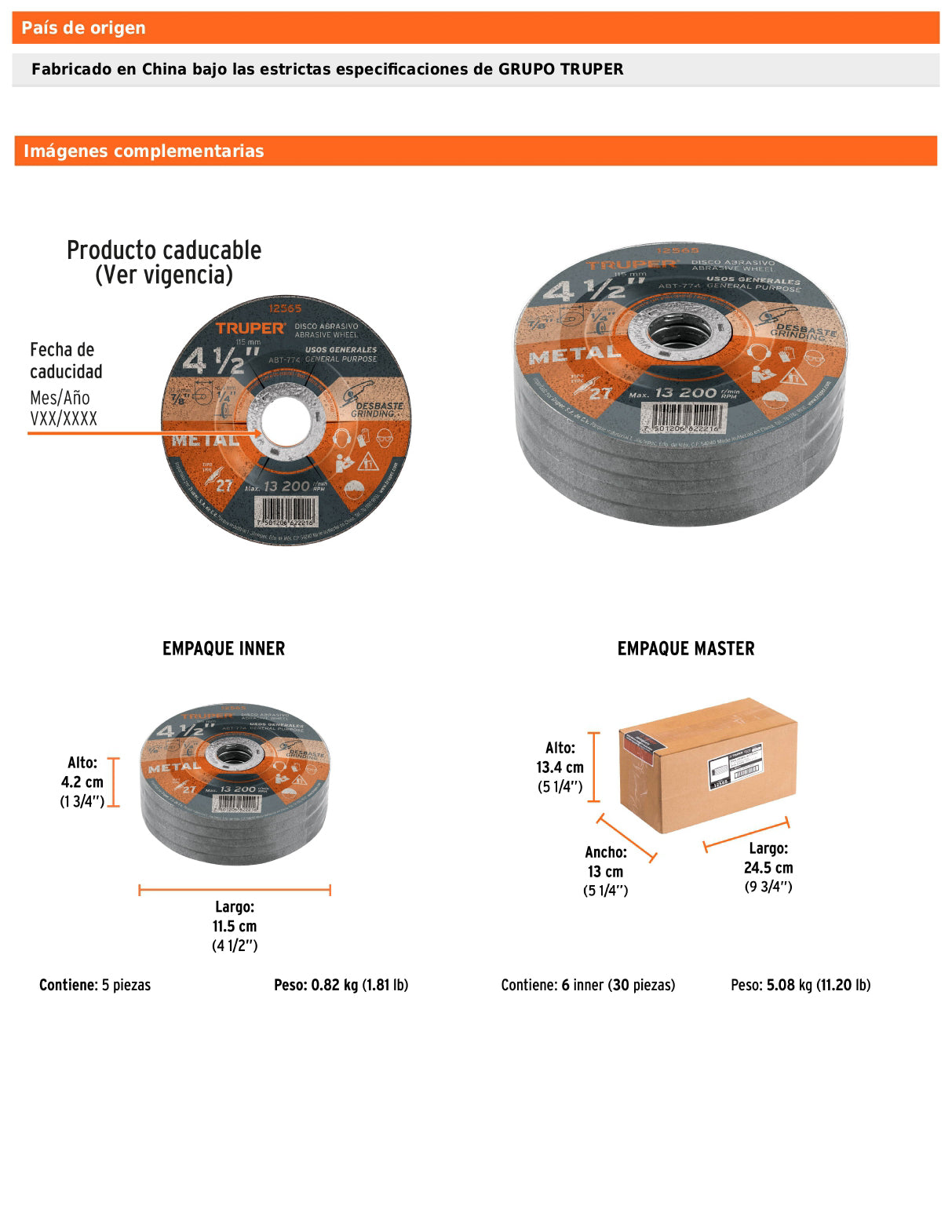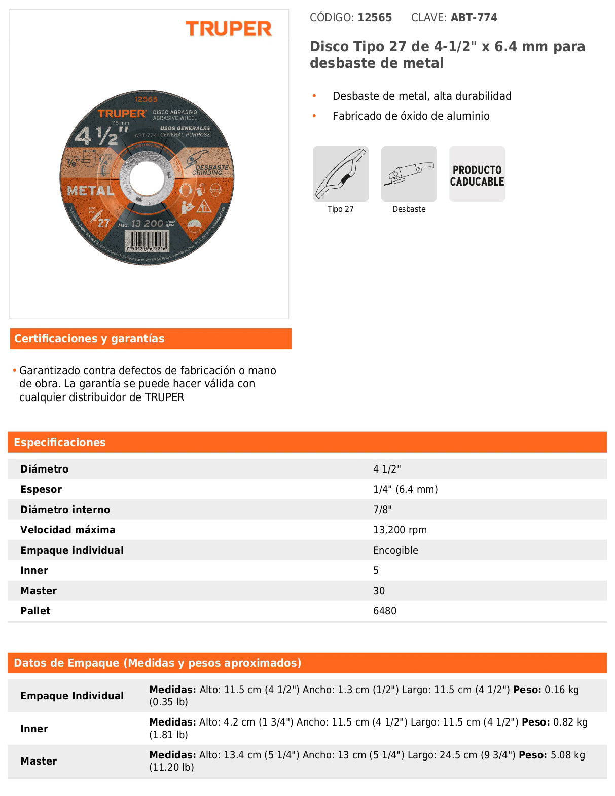 Disco Tipo 27 de 4 1/2 in para desbaste de metal