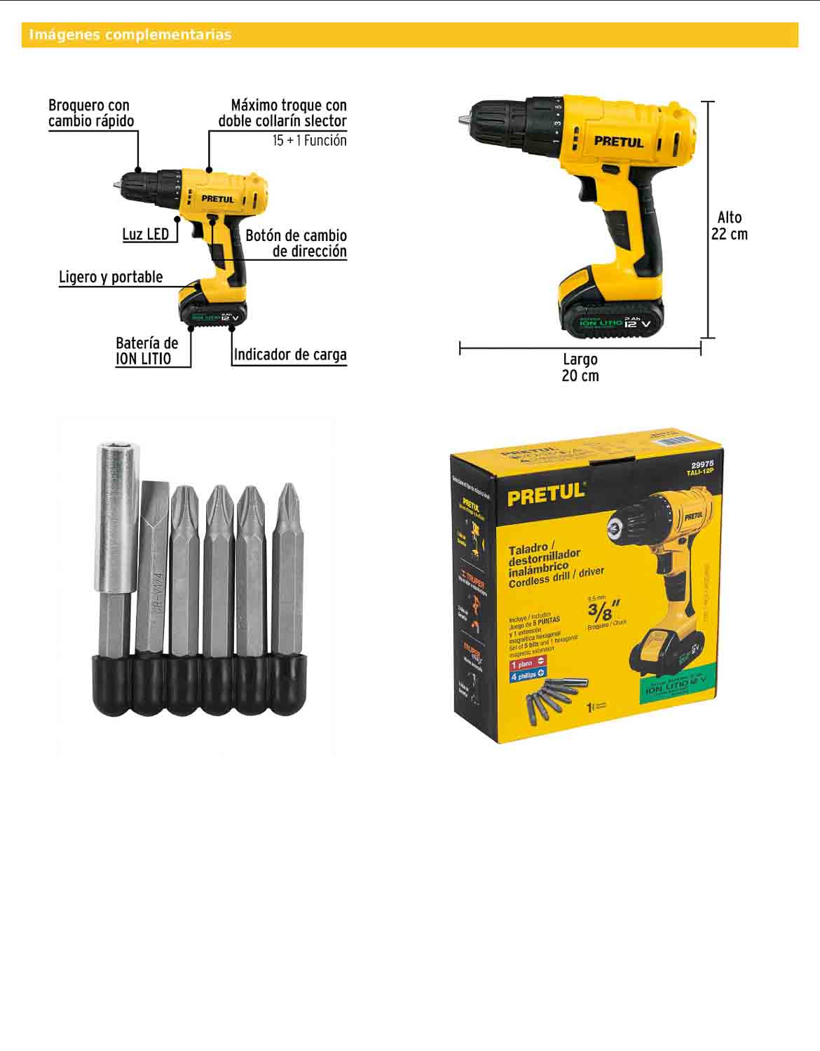 Taladro inalámbrico diseñado para funciones de taladro y destornillador en trabajos de perforación y atornillado en madera y metal. Cuenta con diseño ligero para mayor comodidad, broquero de cambio rápido, luz LED para iluminar el área de trabajo, batería de ion litio de 12 V con capacidad de 2 Ah, 15 niveles de ajuste de torque y compatibilidad con accesorios Pretul para un desempeño confiable en tareas domésticas y de mantenimiento.