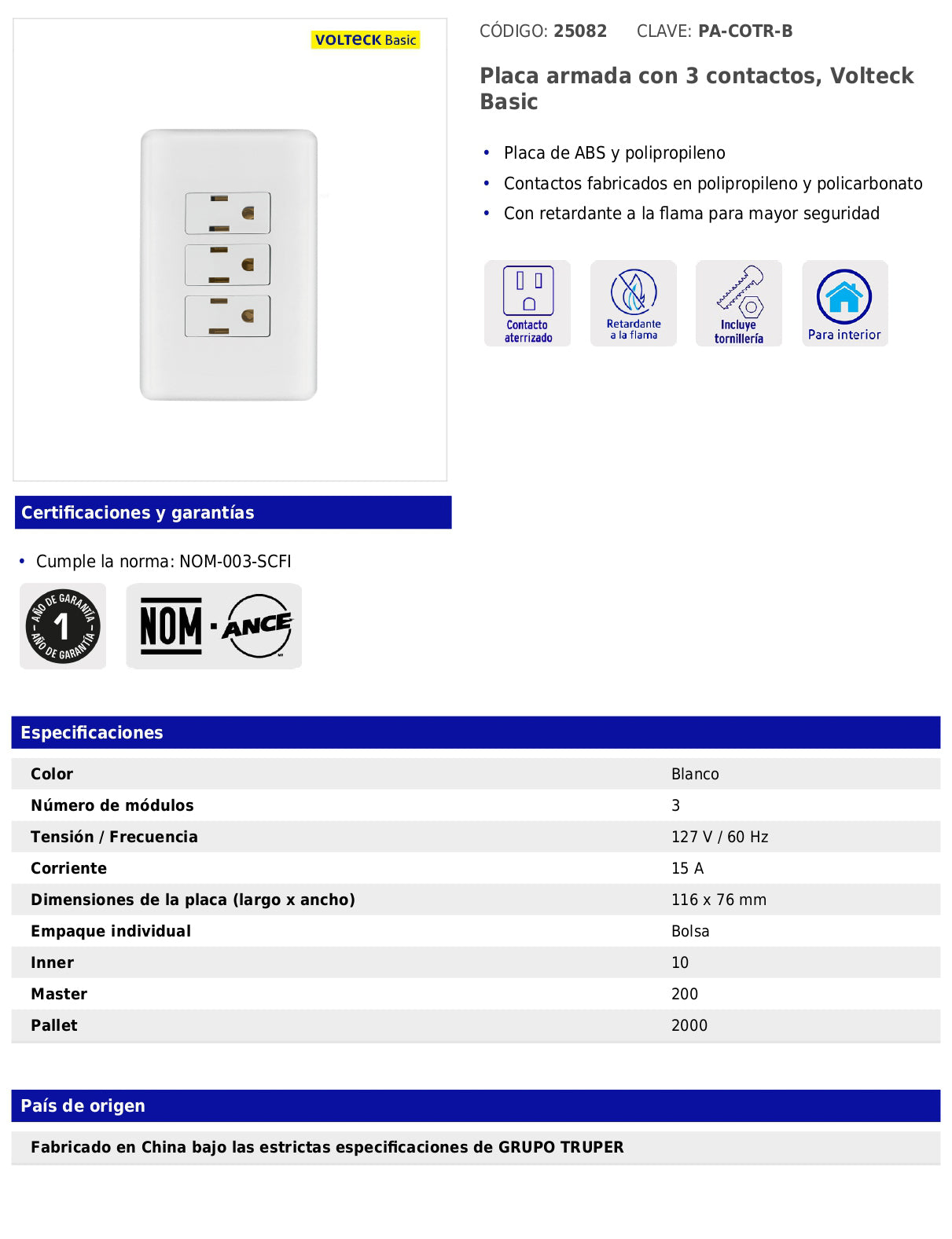 Fabricada con placa de ABS y polipropileno, y contactos en polipropileno y policarbonato, ofrece buena resistencia y mayor seguridad gracias a su retardante a la flama. Cumple con la norma NOM-003-SCFI, garantizando un desempeño confiable en el uso diario.