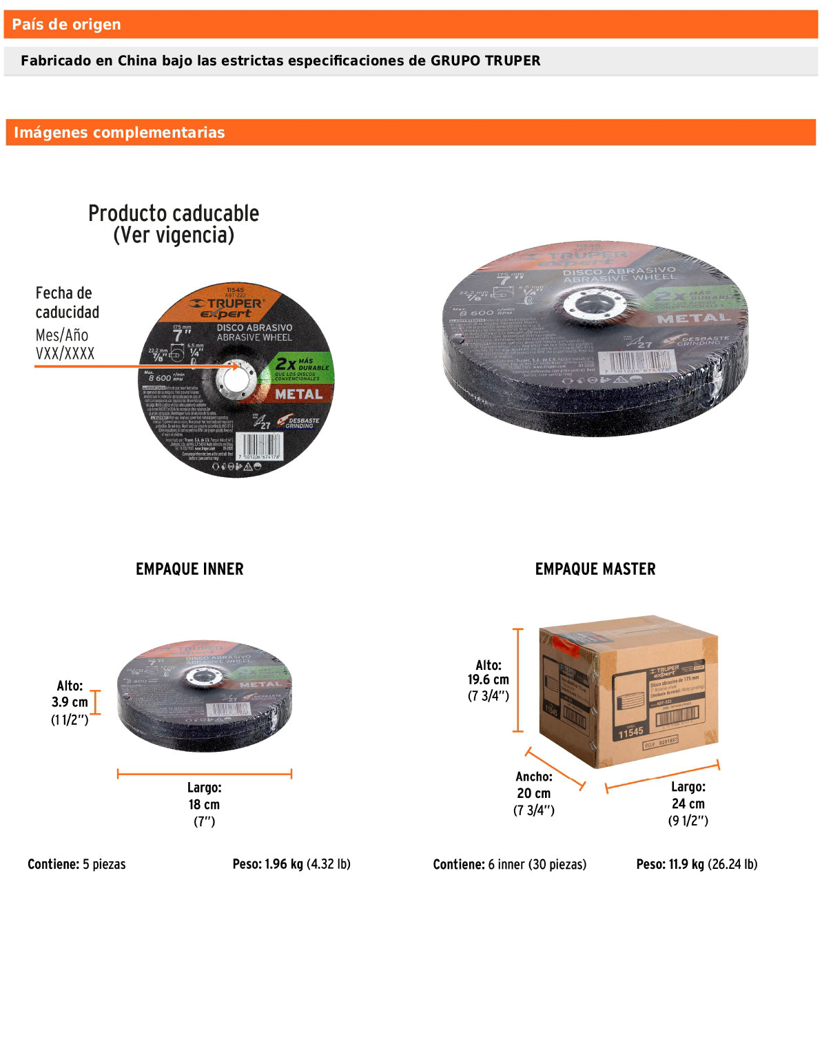 - Diámetro exterior: 7" (180 mm).