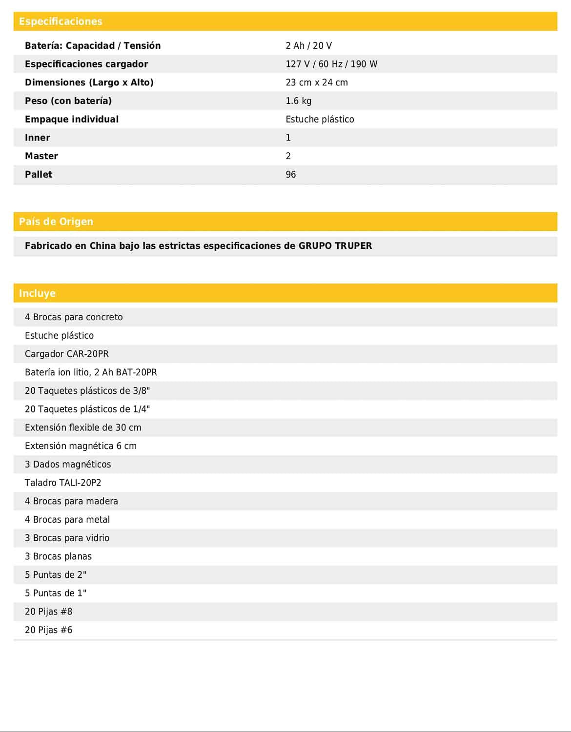 - Batería de ion litio de 20 V con capacidad de 2 Ah.