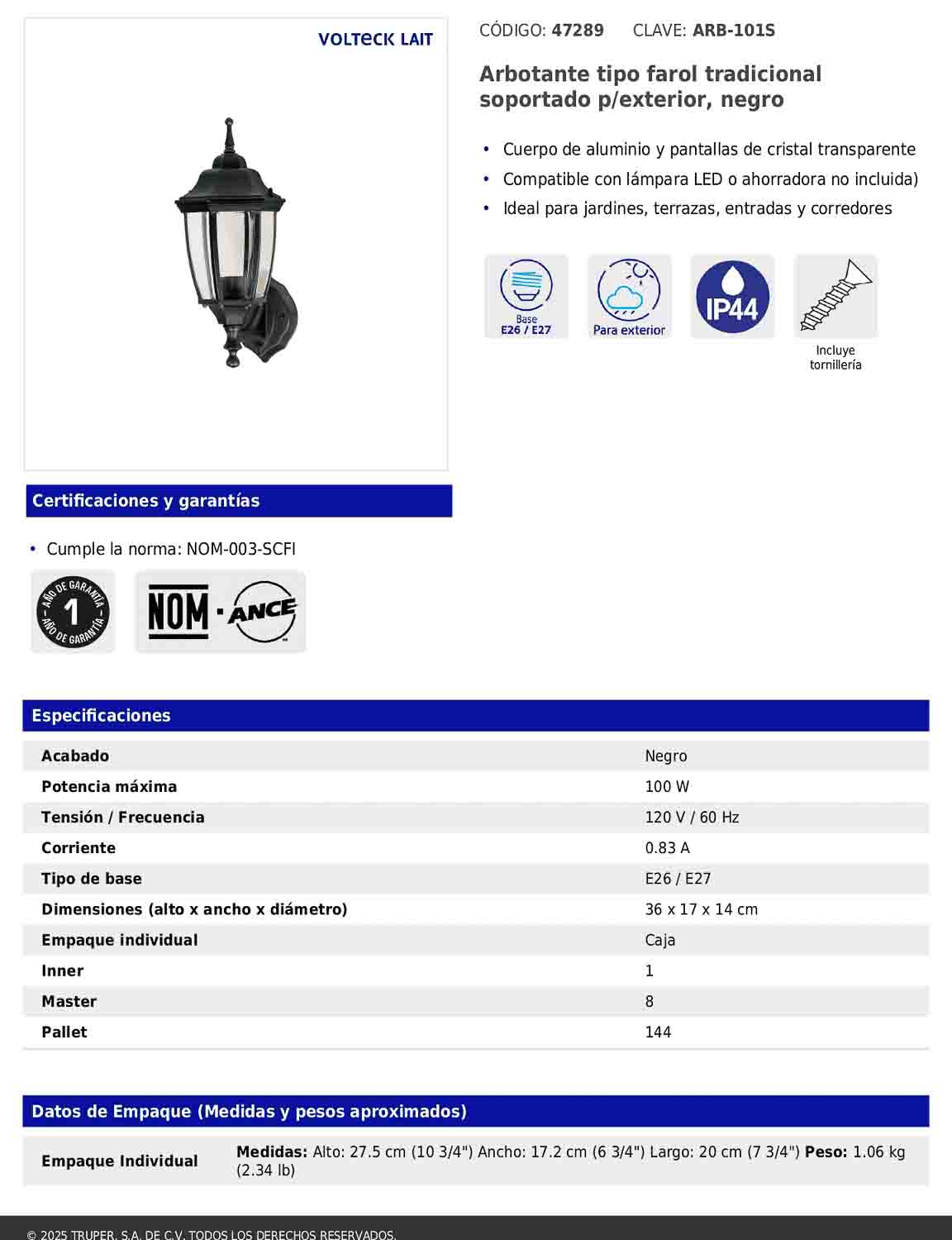 Arbotante tipo farol tradicional para exterior, fabricado con cuerpo de aluminio y pantallas de cristal transparente. Ofrece iluminación decorativa ideal para jardines, corredores, terrazas y entradas. Es compatible con lámparas LED o ahorradoras con base E26/E27 (no incluida) y su diseño clásico brinda una apariencia elegante y resistente. Incluye tornillería para instalación y cumple con la norma NOM-003-SCFI.