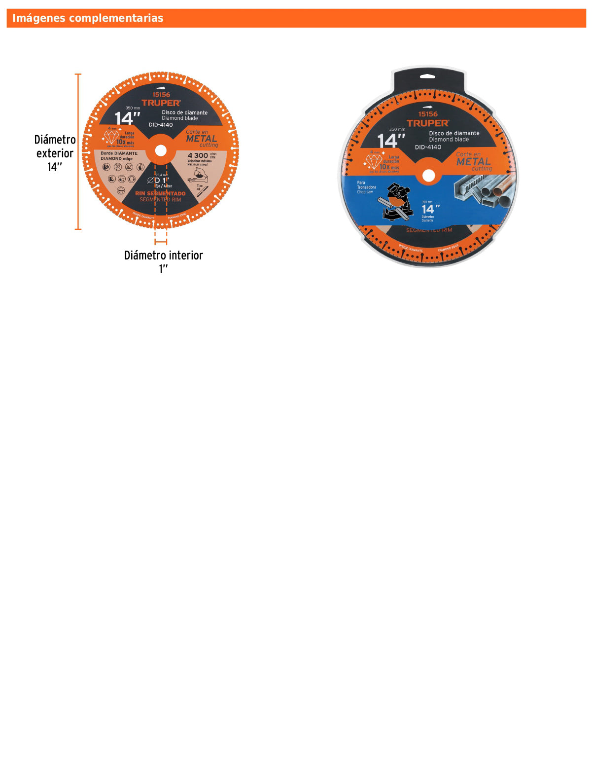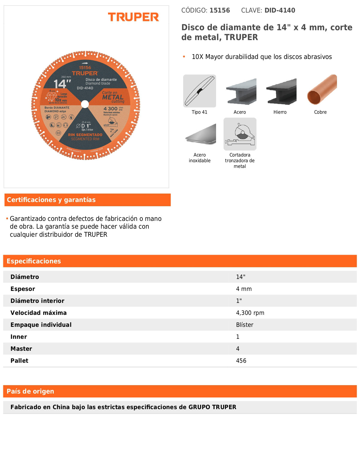 Disco de diamante de 14" para corte de metal con espesor 4 mm