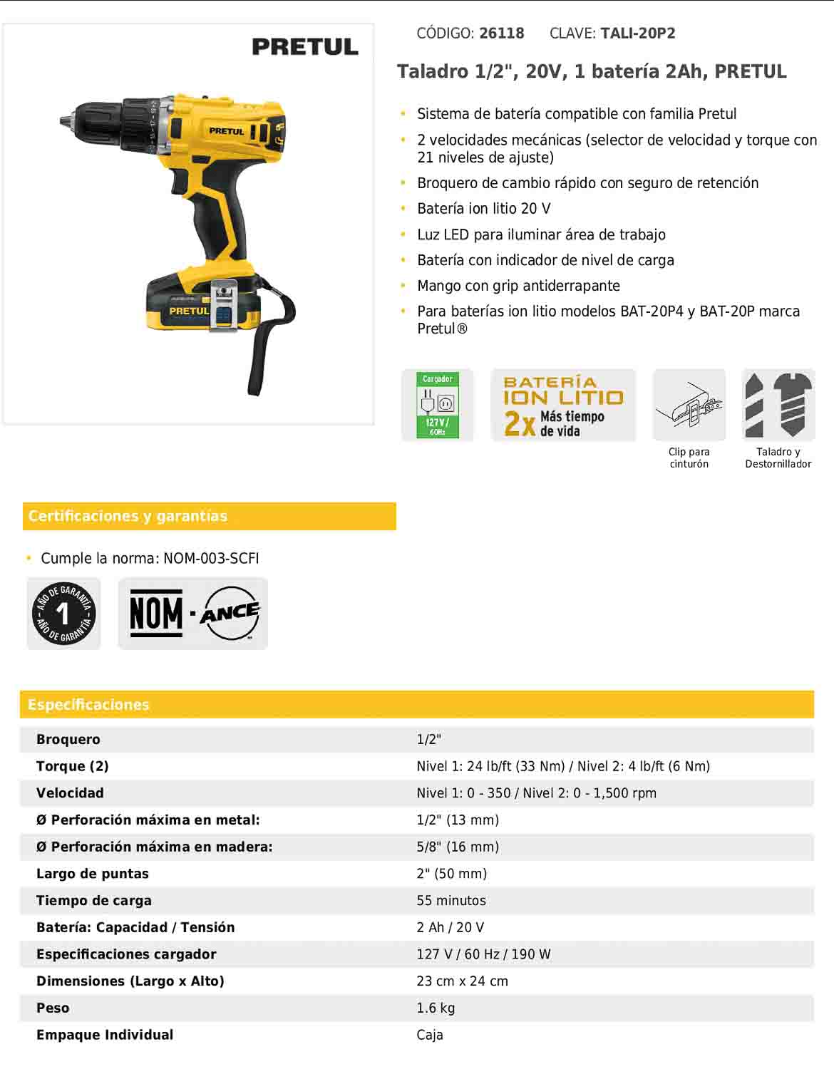 Taladro inalámbrico diseñado para funciones de taladro y destornillador en trabajos de perforación y atornillado. Cuenta con sistema de batería de 20 V compatible con la familia Pretul, dos velocidades mecánicas con 21 niveles de ajuste de torque, broquero de cambio rápido con seguro de retención, luz LED para iluminación del área de trabajo, indicador de nivel de carga y mango con grip antiderrapante para mayor control y comodidad.