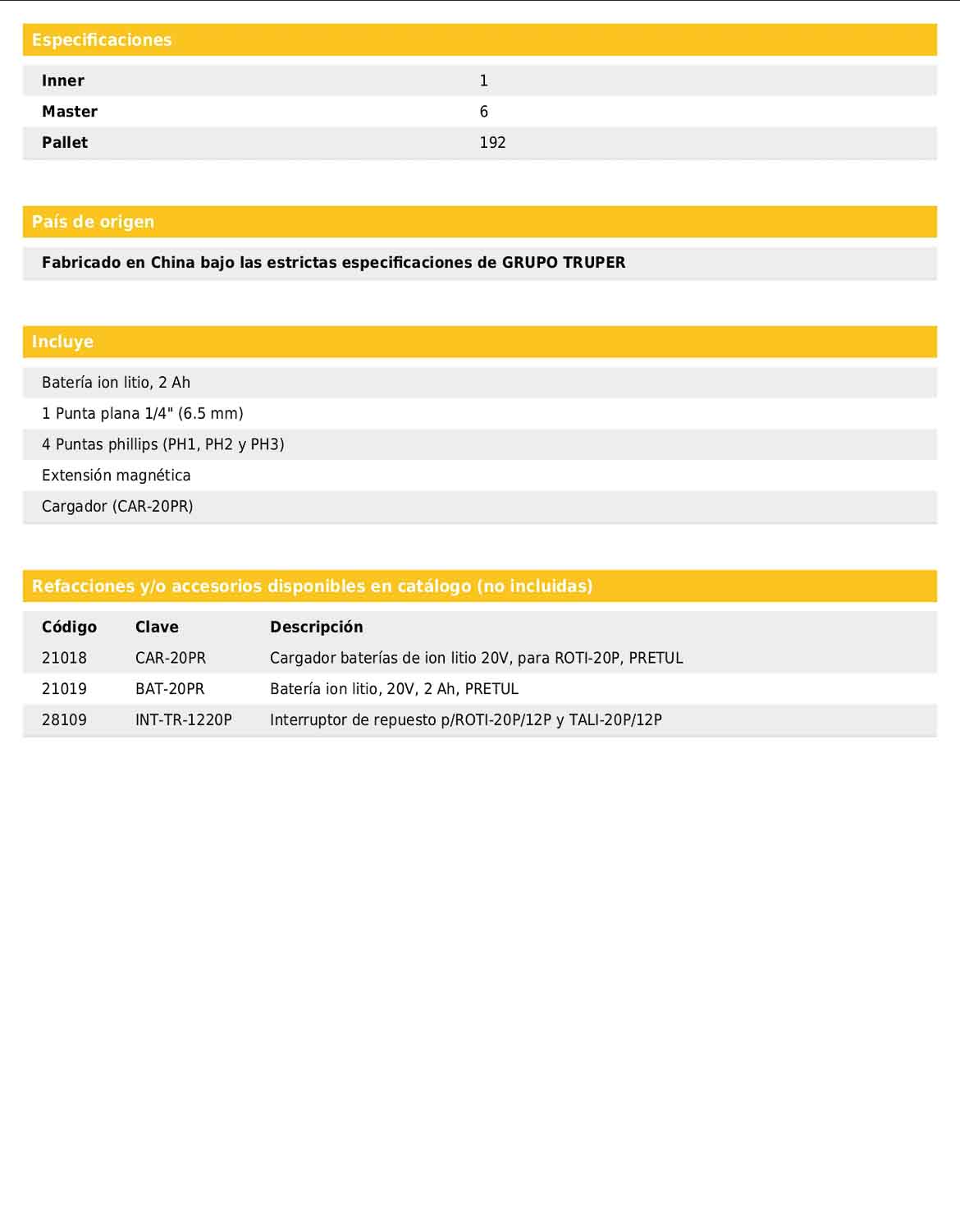 - Batería de ion litio de 20 V con capacidad de 2 Ah.