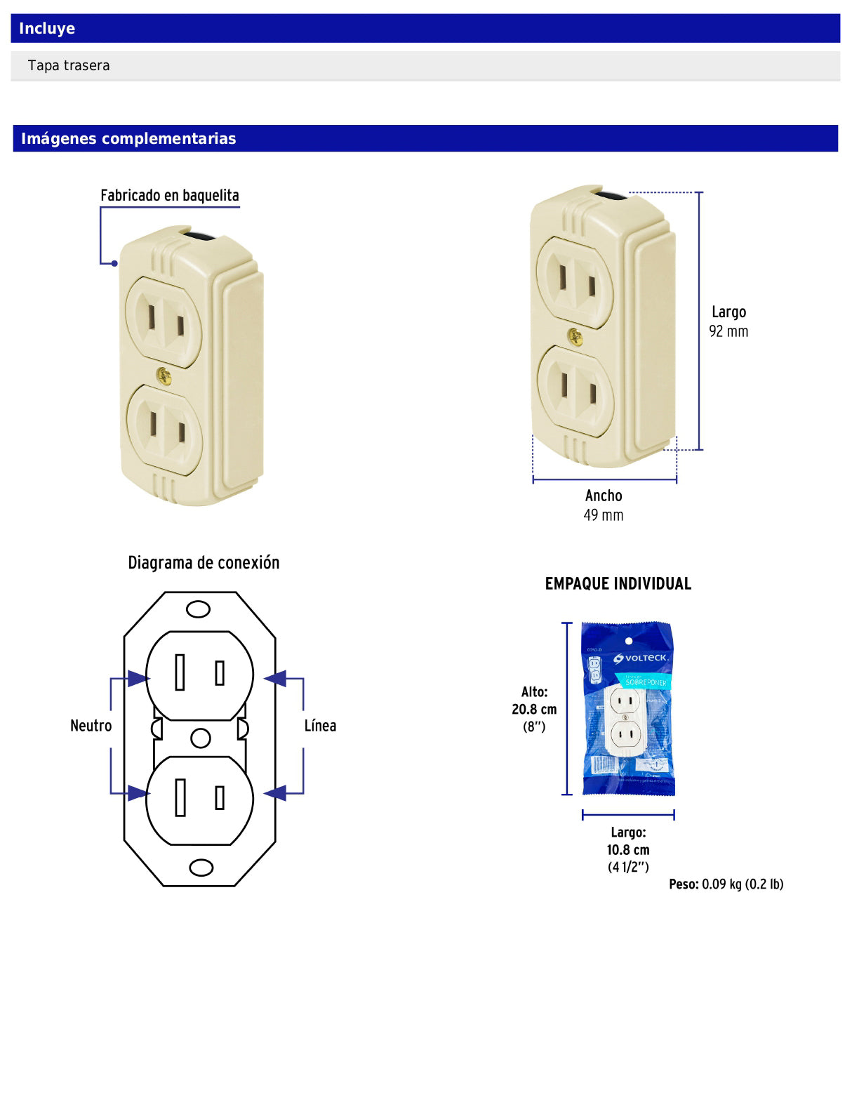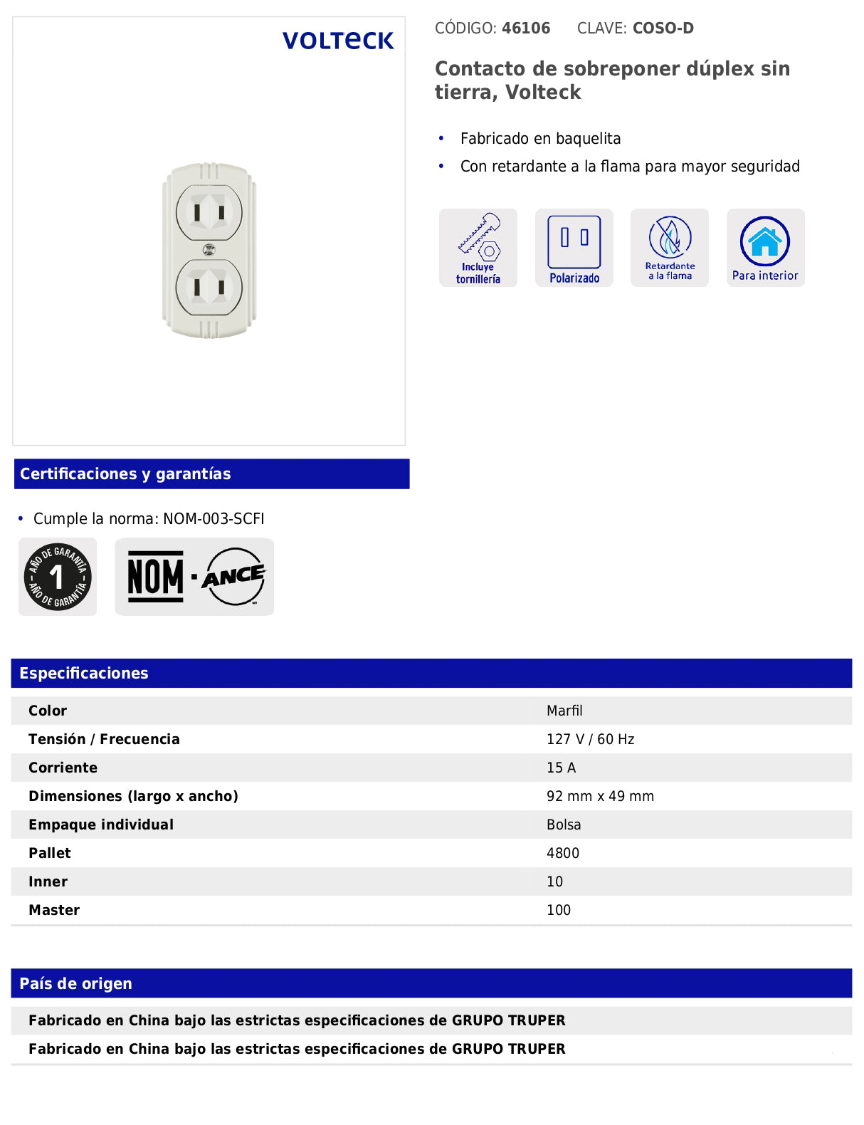 Fabricado en baquelita, ofrece resistencia al uso diario y mayor seguridad gracias a su retardante a la flama. Cumple con la norma NOM-003-SCFI, garantizando un desempeño confiable.