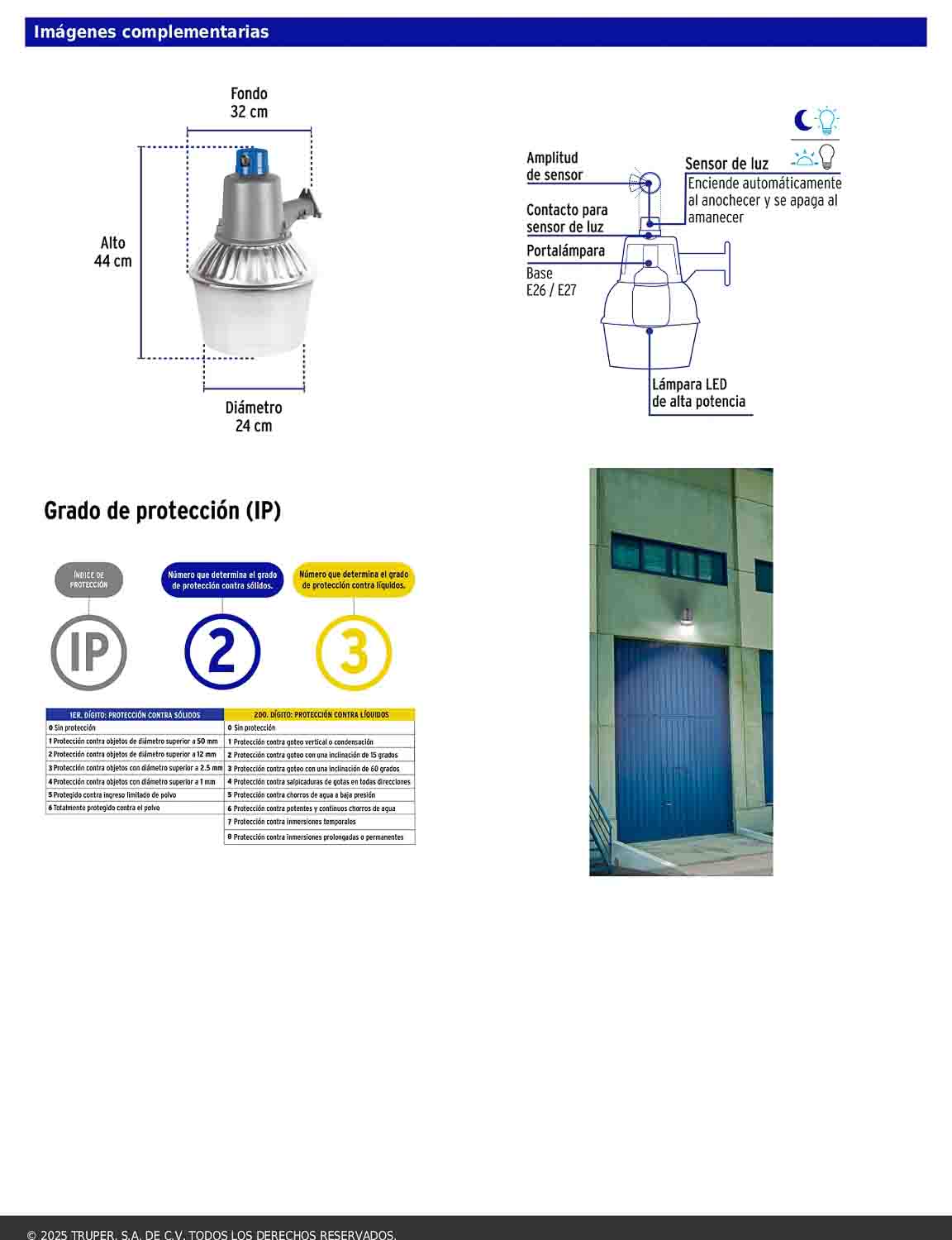 Luminario suburbano con cuerpo de aluminio y pantalla de poliestireno resistente a la intemperie. Incluye lámpara LED de alta potencia y sensor de luz integrado que permite el encendido automático al anochecer y el apagado al amanecer. Es compatible con lámparas LED, ahorradoras o incandescentes con base E26/E27. Diseñado para iluminar áreas perimetrales en residencias, comercios, estacionamientos y zonas de descarga.