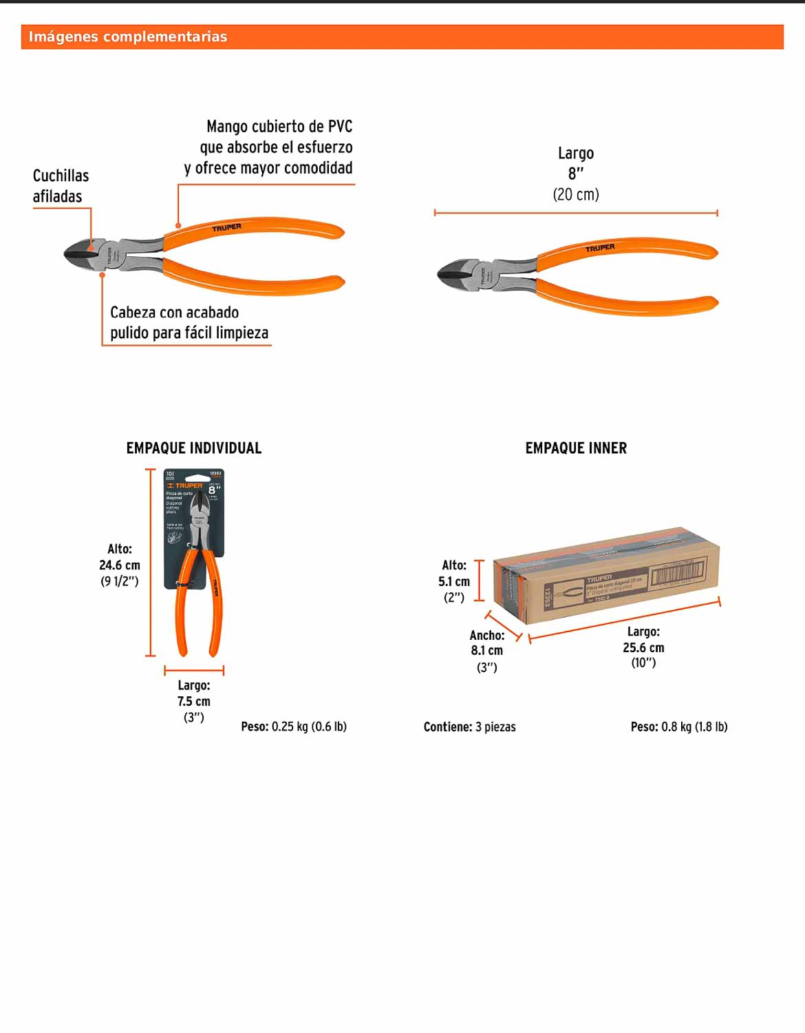Pinza de corte diagonal de 20 cm con mango de PVC