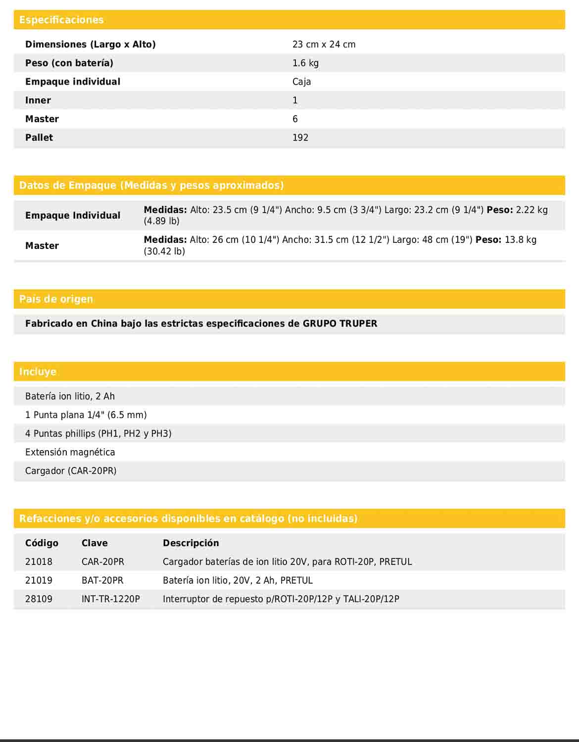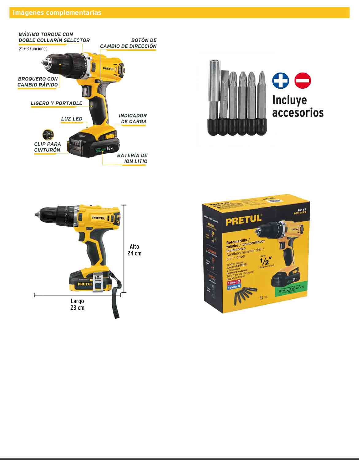 Rotomartillo inalámbrico diseñado para funciones de taladro, destornillador y rotomartillo en aplicaciones de perforación y atornillado. Cuenta con sistema de batería de 20 V compatible con la familia Pretul, dos velocidades mecánicas con 21 niveles de ajuste de torque, broquero de cambio rápido con seguro de retención, luz LED para iluminación del área de trabajo, indicador de nivel de carga y mango con grip antiderrapante para mayor control y comodidad.