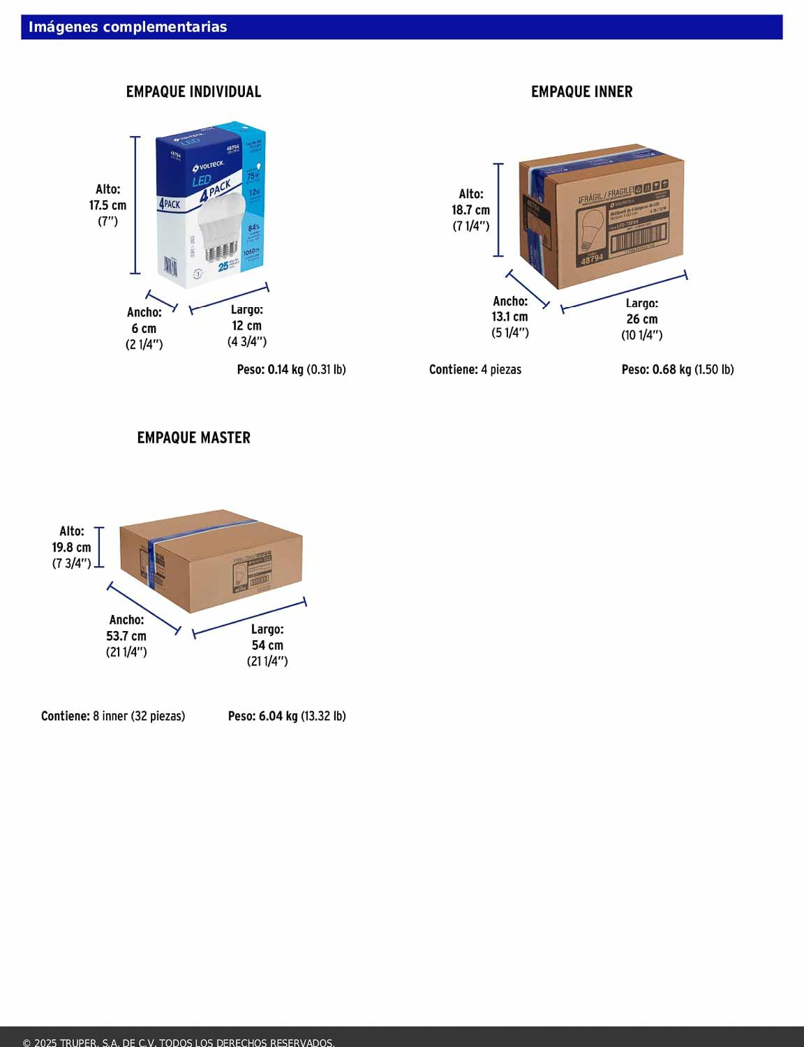 Paquete de cuatro focos LED diseñados para ofrecer iluminación eficiente y uniforme, con un ahorro energético de hasta 84% respecto a los focos incandescentes. Brindan encendido instantáneo, luz blanca fría de 6500 K y distribución omnidireccional. Fabricados con cuerpo de PBT o nylon y pantalla de policarbonato, garantizan durabilidad y no son compatibles con atenuadores.
