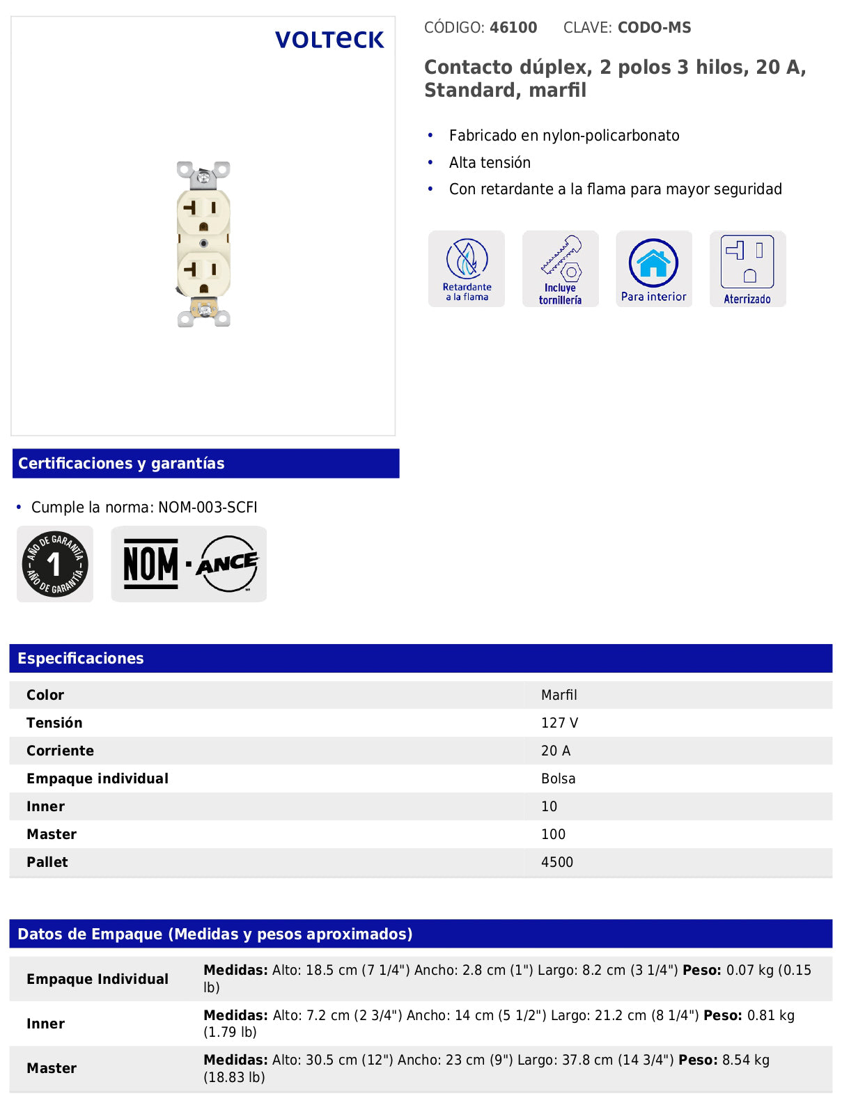 Fabricado en nylon-policarbonato, brinda buena resistencia mecánica y protección adicional gracias a su retardante a la flama. Cumple con la norma NOM-003-SCFI, garantizando un desempeño confiable en aplicaciones residenciales o comerciales ligeras.