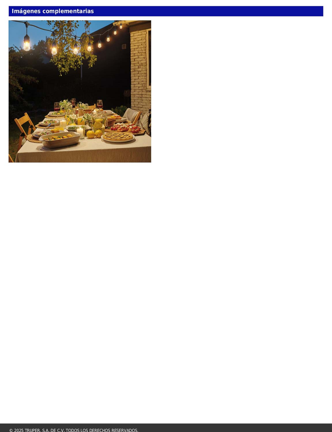 Serie de luces incandescentes para exterior con 24 lámparas incluidas, diseñada para decorar terrazas, jardines, fachadas y comercios. Es compatible con lámparas tipo S14 y cuenta con receptáculo para conectar otra serie. Ofrece iluminación cálida de 3000 K y una separación de 55 cm entre sockets, adecuada para crear ambientes acogedores en exteriores. Cumple con la norma NOM-003-SCFI.