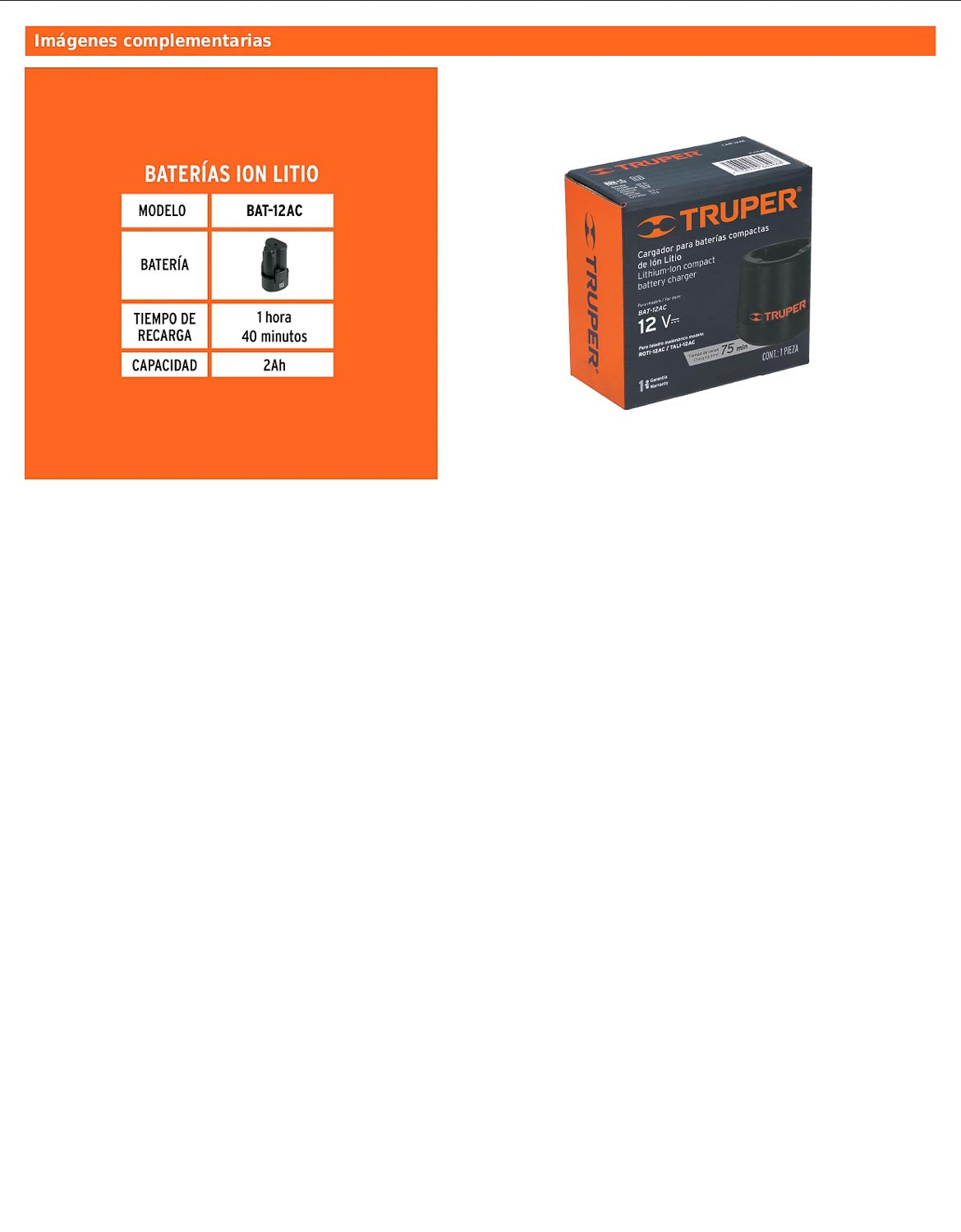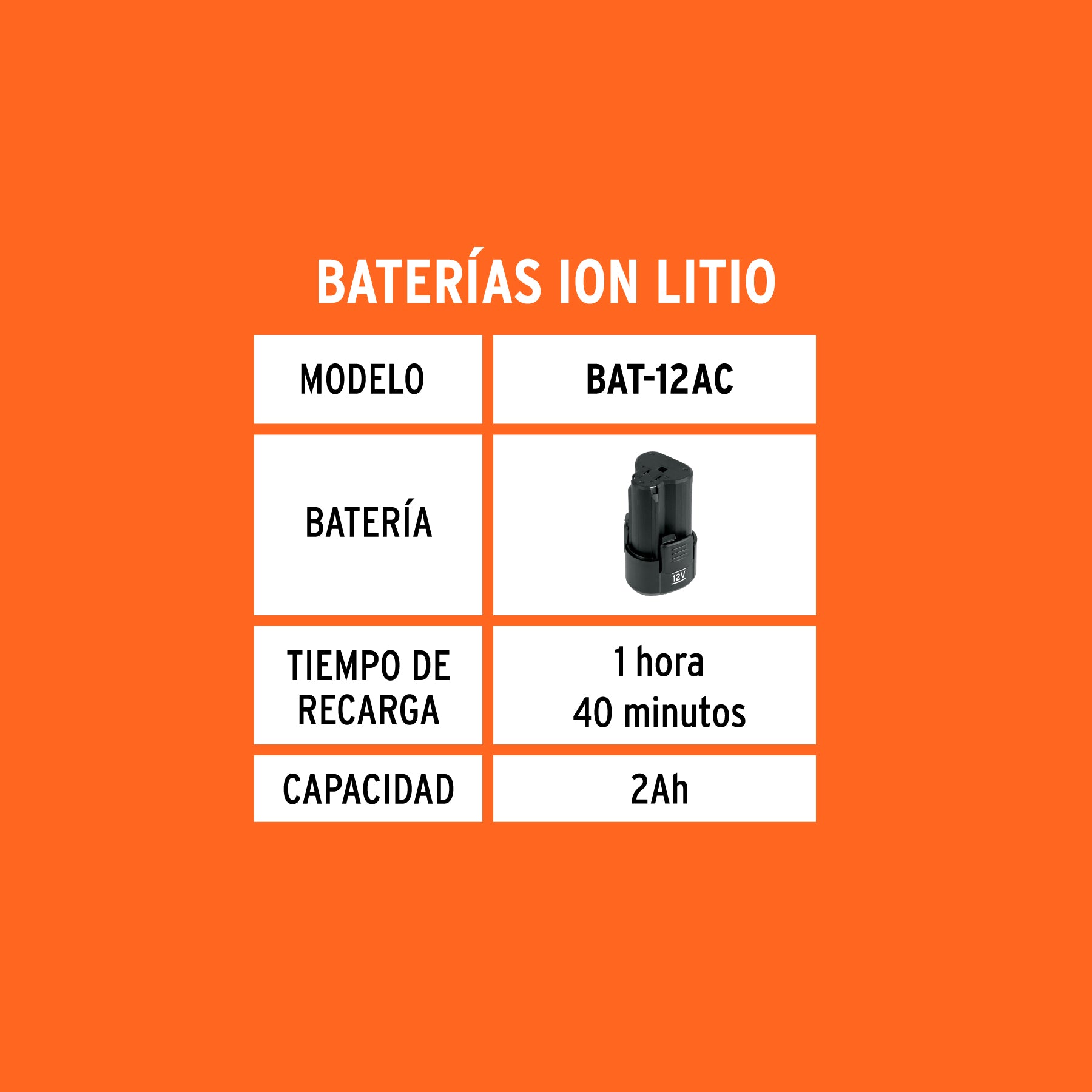 - Tiempo de recarga de 1 hora con 40 minutos para batería BAT-12AC.
