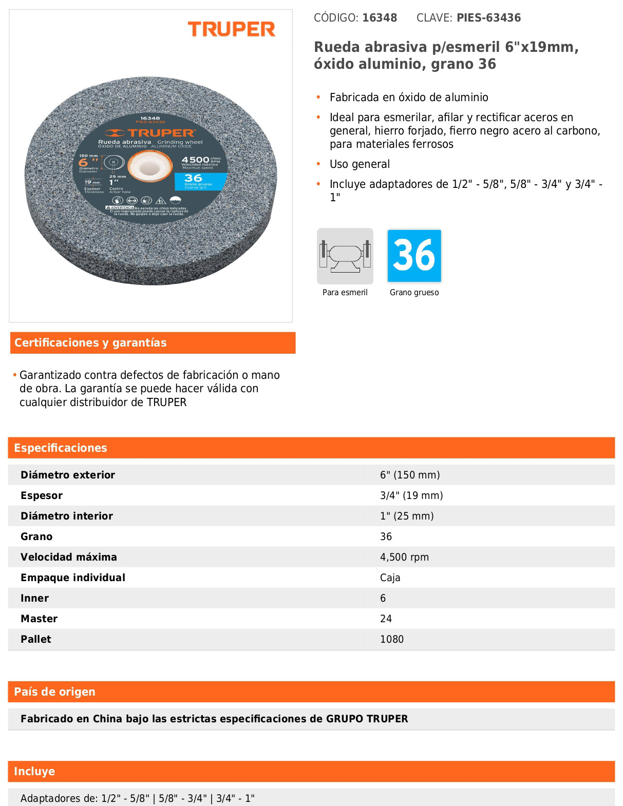 Rueda abrasiva fabricada en óxido de aluminio, diseñada para esmerilar, afilar y rectificar aceros en general, hierro forjado, fierro negro y acero al carbono. Ofrece un desempeño confiable para desbaste más agresivo gracias a su grano grueso, ideal para uso general en materiales ferrosos y compatible con esmeriles de banco; incluye adaptadores que permiten su montaje en diferentes diámetros de eje.