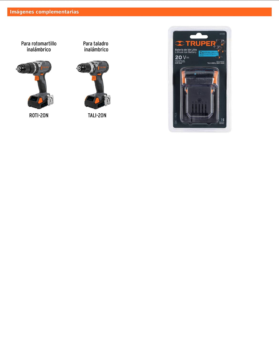 - Compatible con rotomartillo inalámbrico ROTI-20N y taladro inalámbrico TALI-20N.