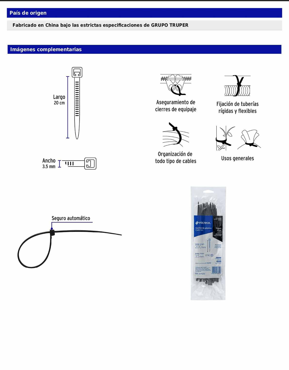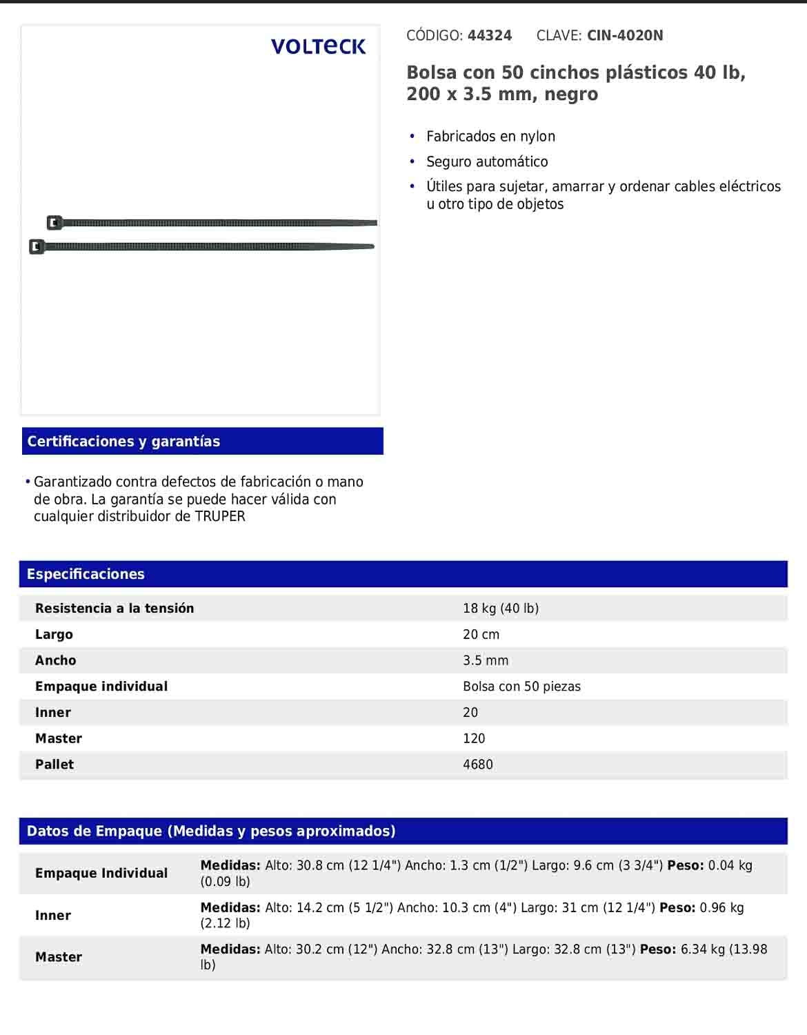 Bolsa con 50 cinchos plásticos 40 lb 200 x 3.5 mm negro