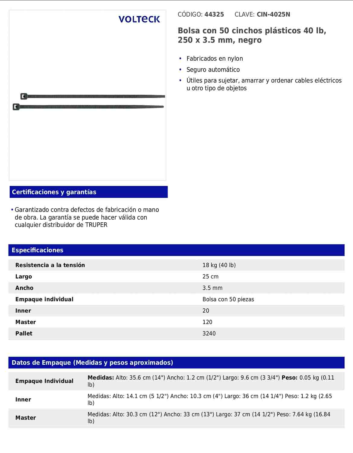 Bolsa con 50 cinchos plásticos 40 lb 250 x 3.5 mm negro