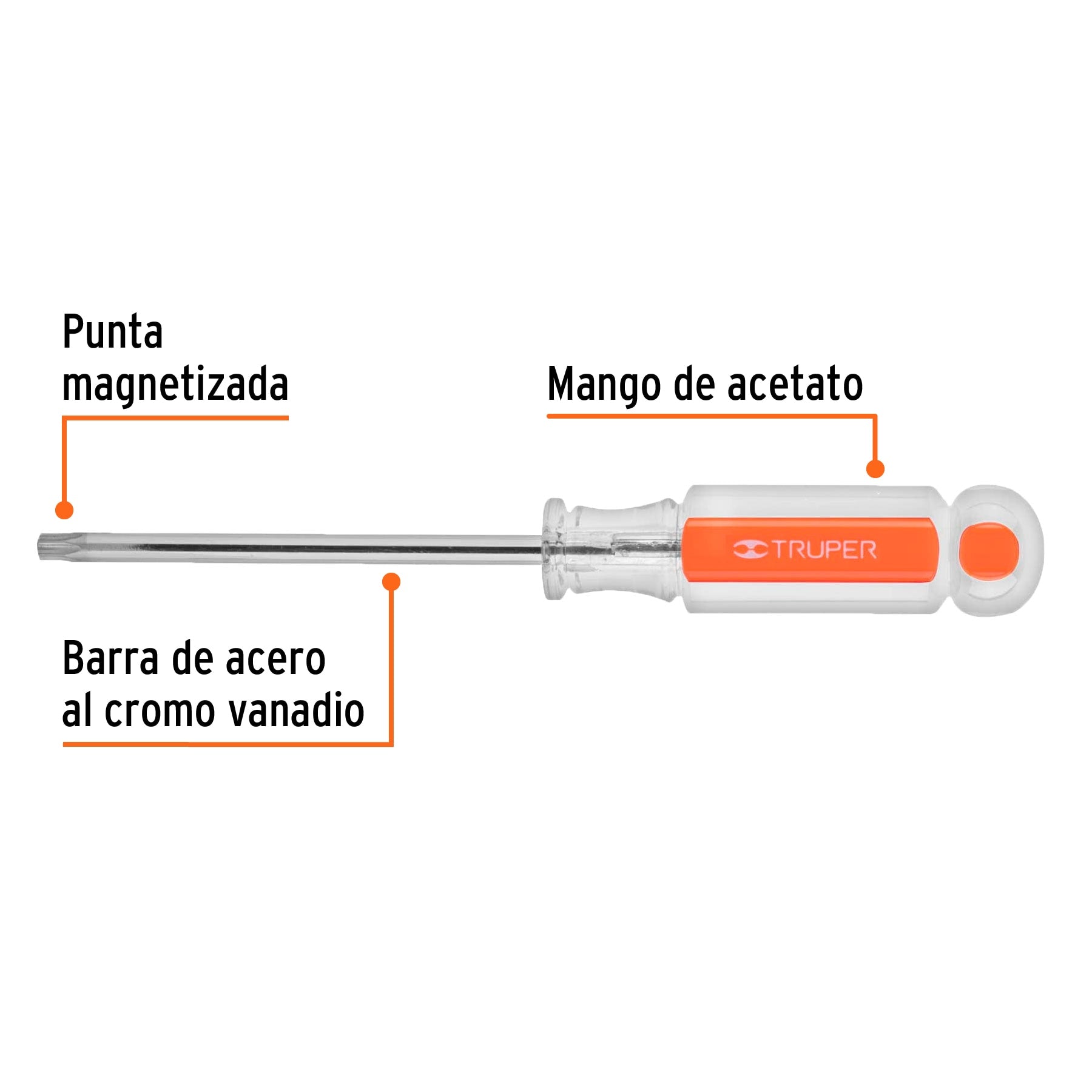 Desarmador con punta Torx T-27 diseñado para trabajos de mantenimiento y ensamble que requieren mayor resistencia. Cuenta con barra de acero al cromo vanadio para mayor durabilidad y mango de acetato con alta resistencia al impacto y a solventes. La punta magnetizada facilita la sujeción del tornillo durante el uso.