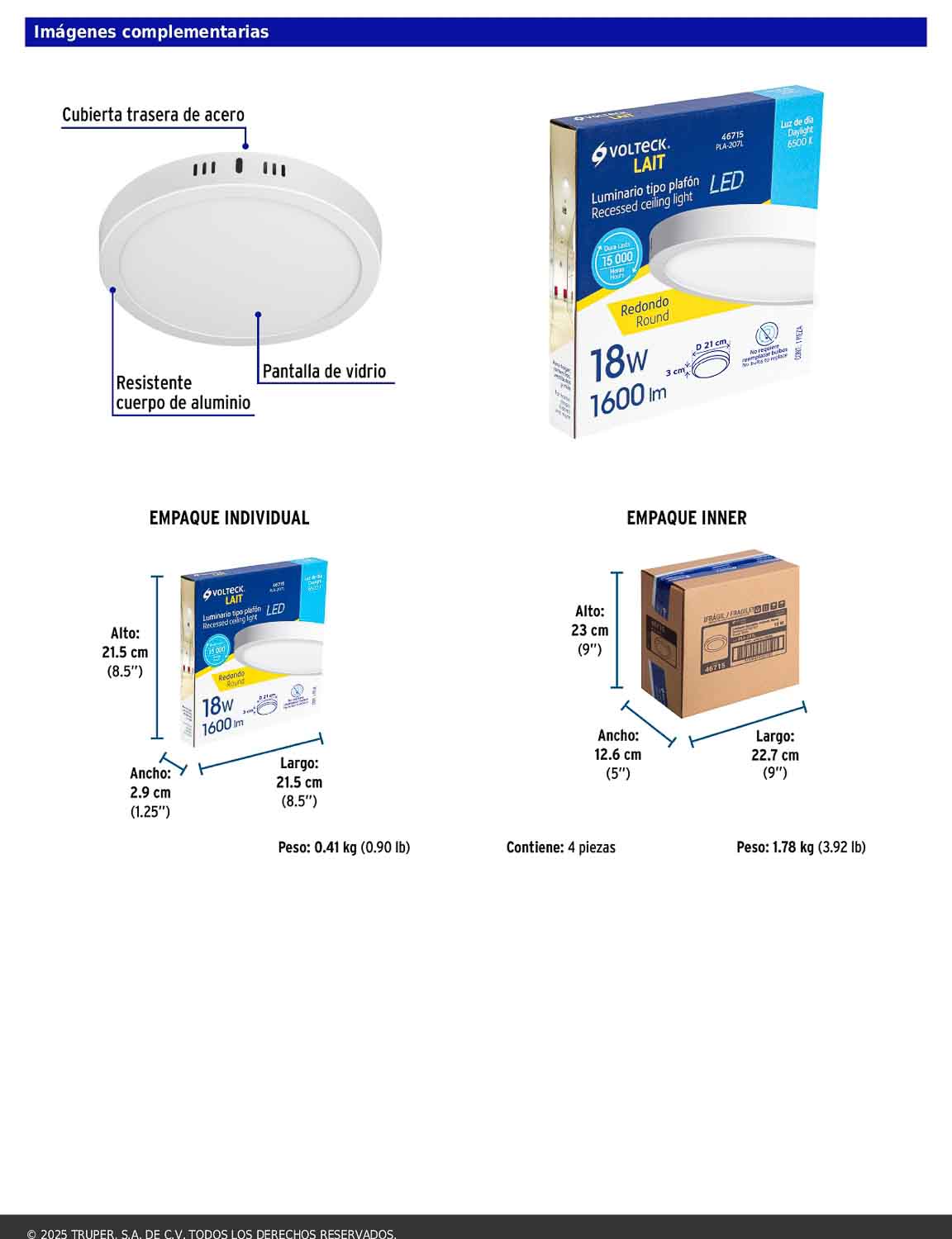 Luminario LED plafón redondo de 18 W, fabricado con cuerpo de aluminio, cubierta trasera de acero y pantalla de vidrio. Proporciona encendido instantáneo al 100% de brillo y un ahorro energético de hasta 84%. Su diseño robusto y eficiente lo hace ideal para hogares, comercios y vestíbulos. Incluye driver e integra LED para una iluminación uniforme y duradera. Cumple con la norma NOM-003-SCFI.