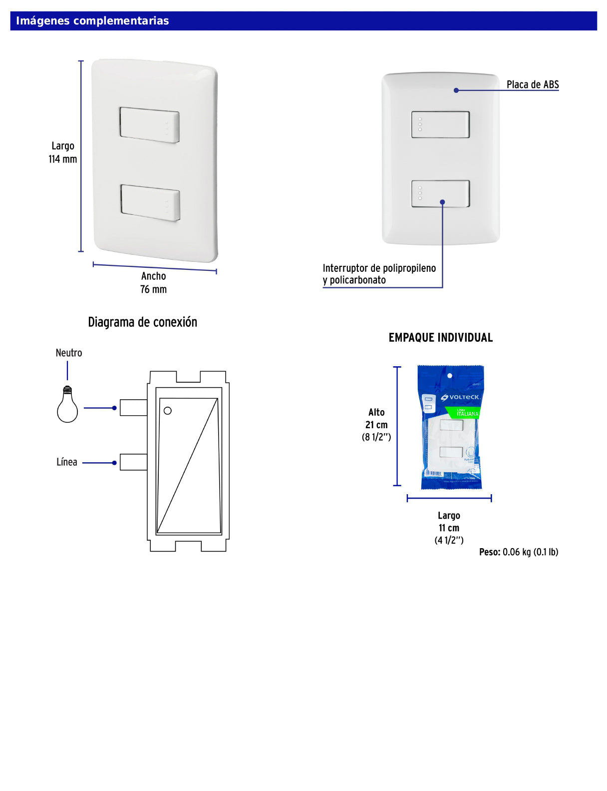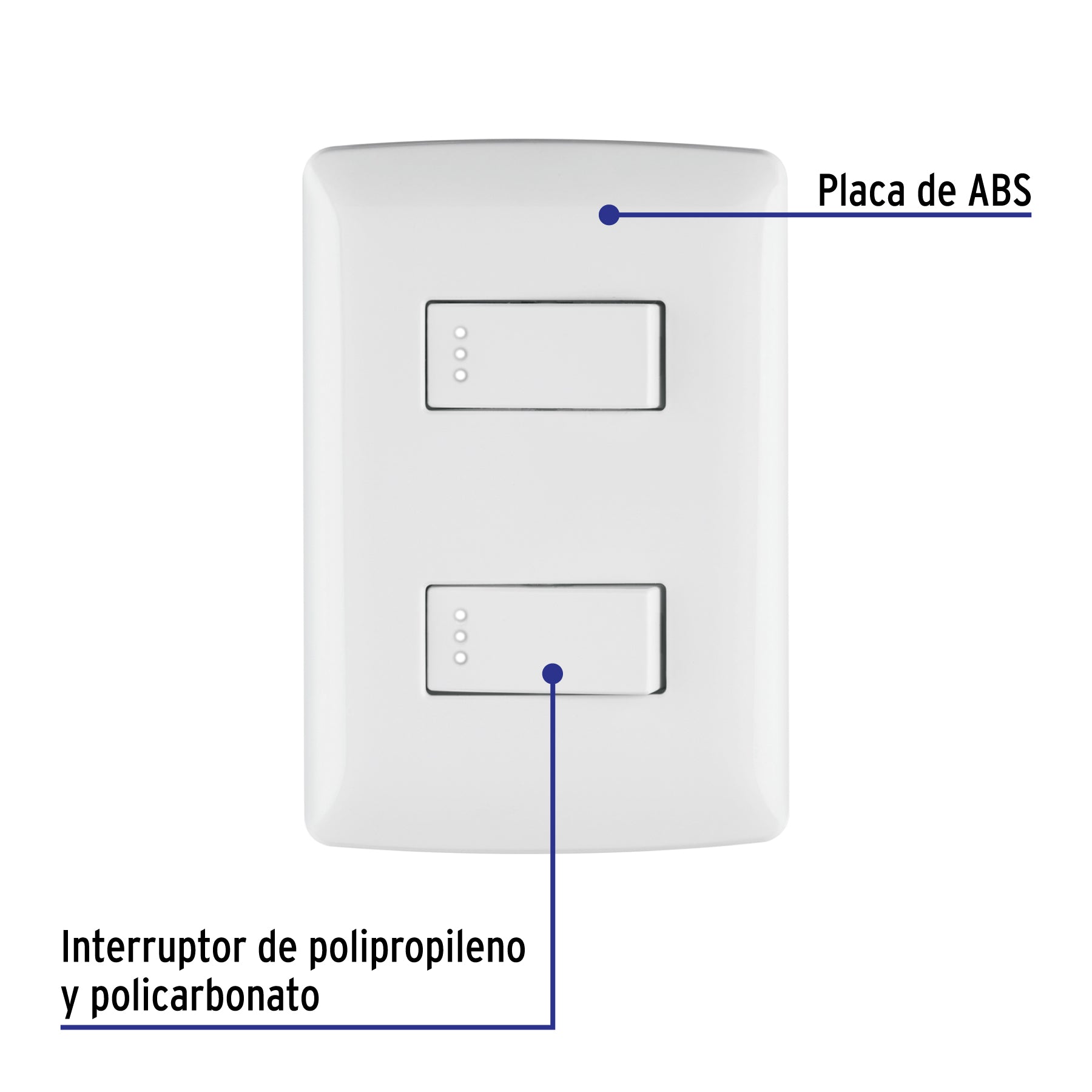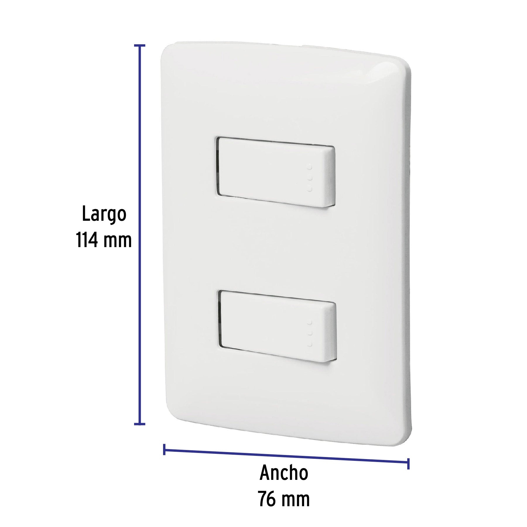 Diseñada para instalaciones eléctricas interiores, esta placa armada integra dos interruptores sencillos en un formato compacto y funcional. Su construcción en materiales plásticos resistentes garantiza durabilidad y un desempeño seguro en aplicaciones residenciales o comerciales ligeras.