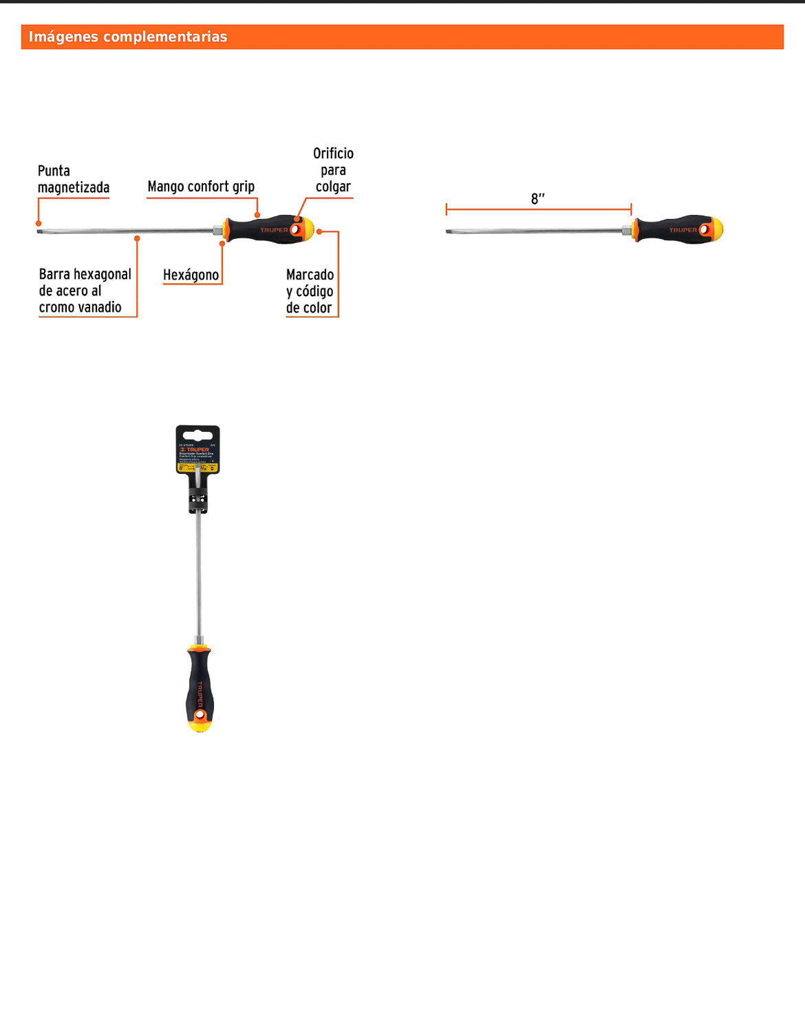 Desarmador tipo cabinet diseñado para trabajos de precisión y ajuste fino. Incorpora barra hexagonal de acero al cromo vanadio que maximiza el torque con llave, punta magnetizada y mango Comfort Grip con orificio para colgar. Incluye marcado y código de color para una rápida identificación de la medida y la punta, ideal para uso profesional continuo.