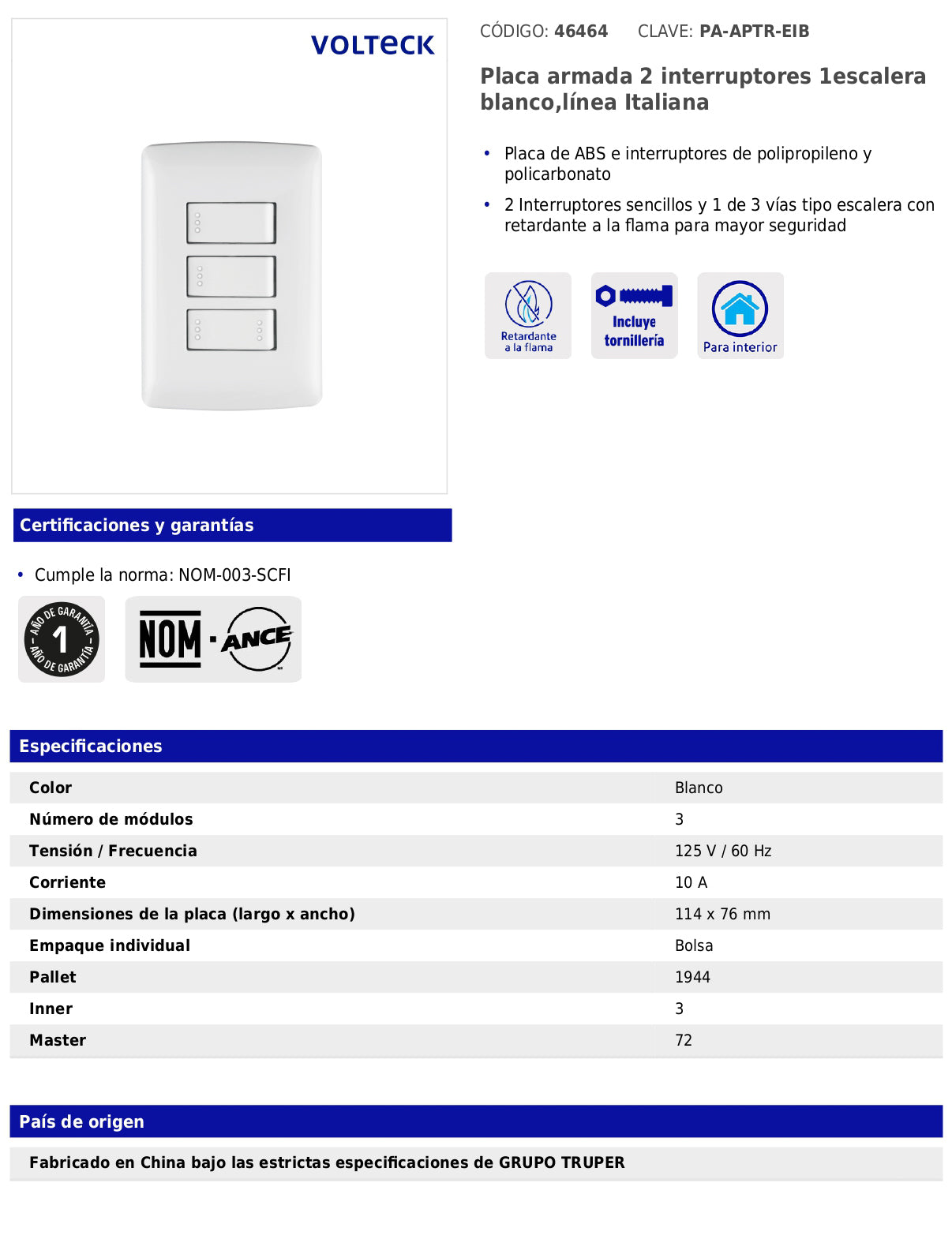 - País de origen: Fabricado en China bajo las estrictas especificaciones de GRUPO TRUPER.