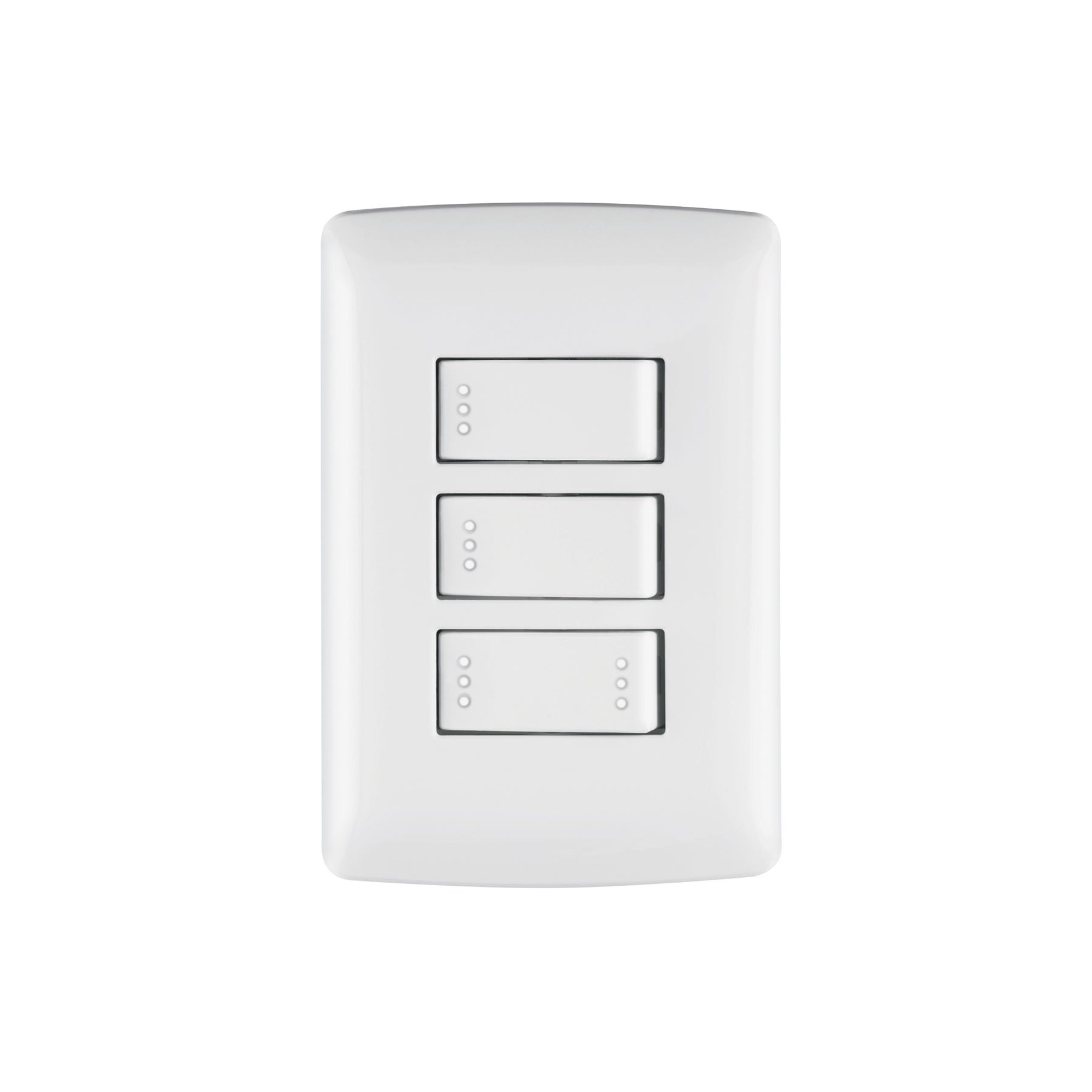 Placa armada para instalaciones eléctricas interiores que integra dos interruptores sencillos y un interruptor de 3 vías tipo escalera en un módulo triple. Es ideal para uso residencial o comercial, permitiendo el control de luminarias desde distintos puntos de conexión.