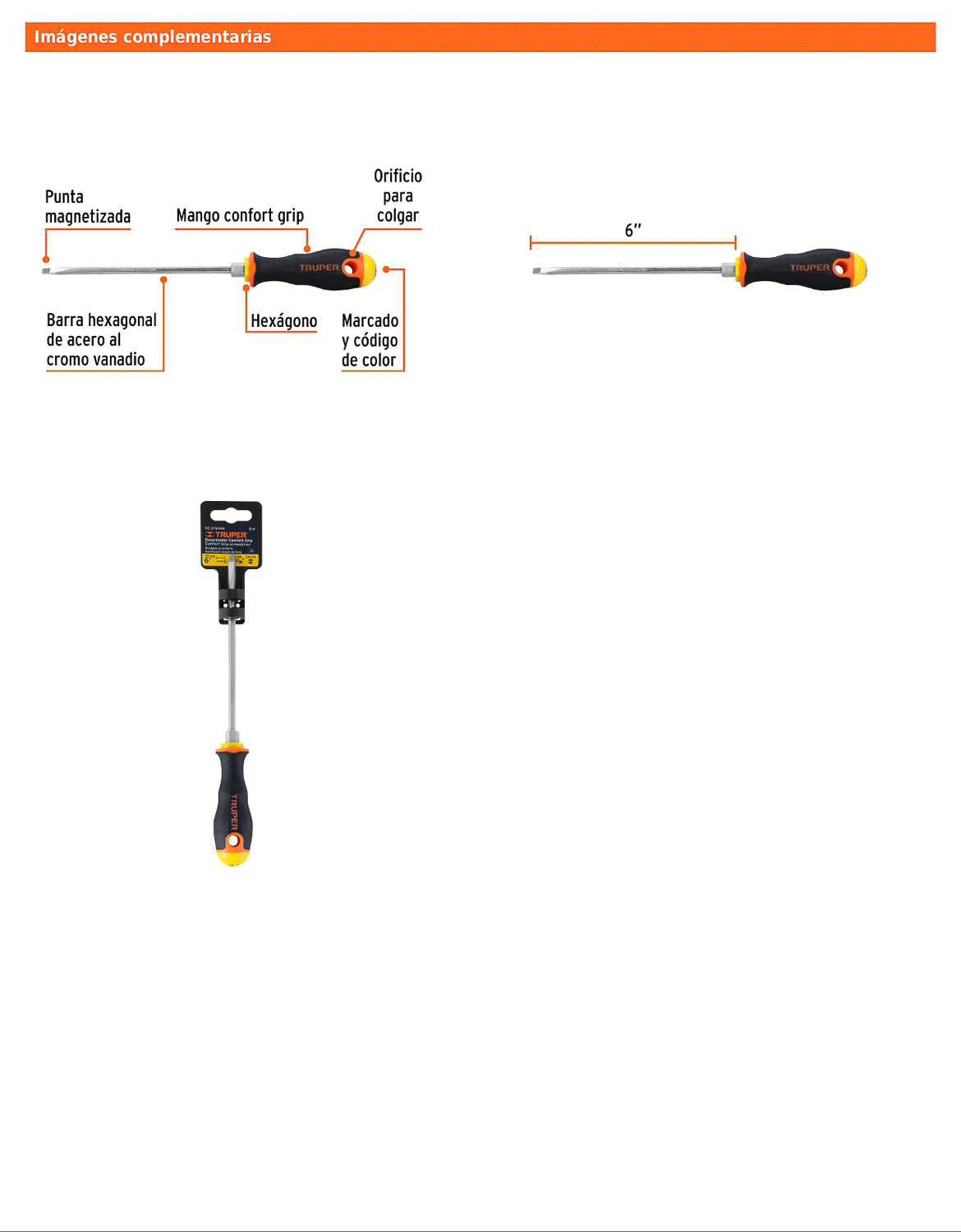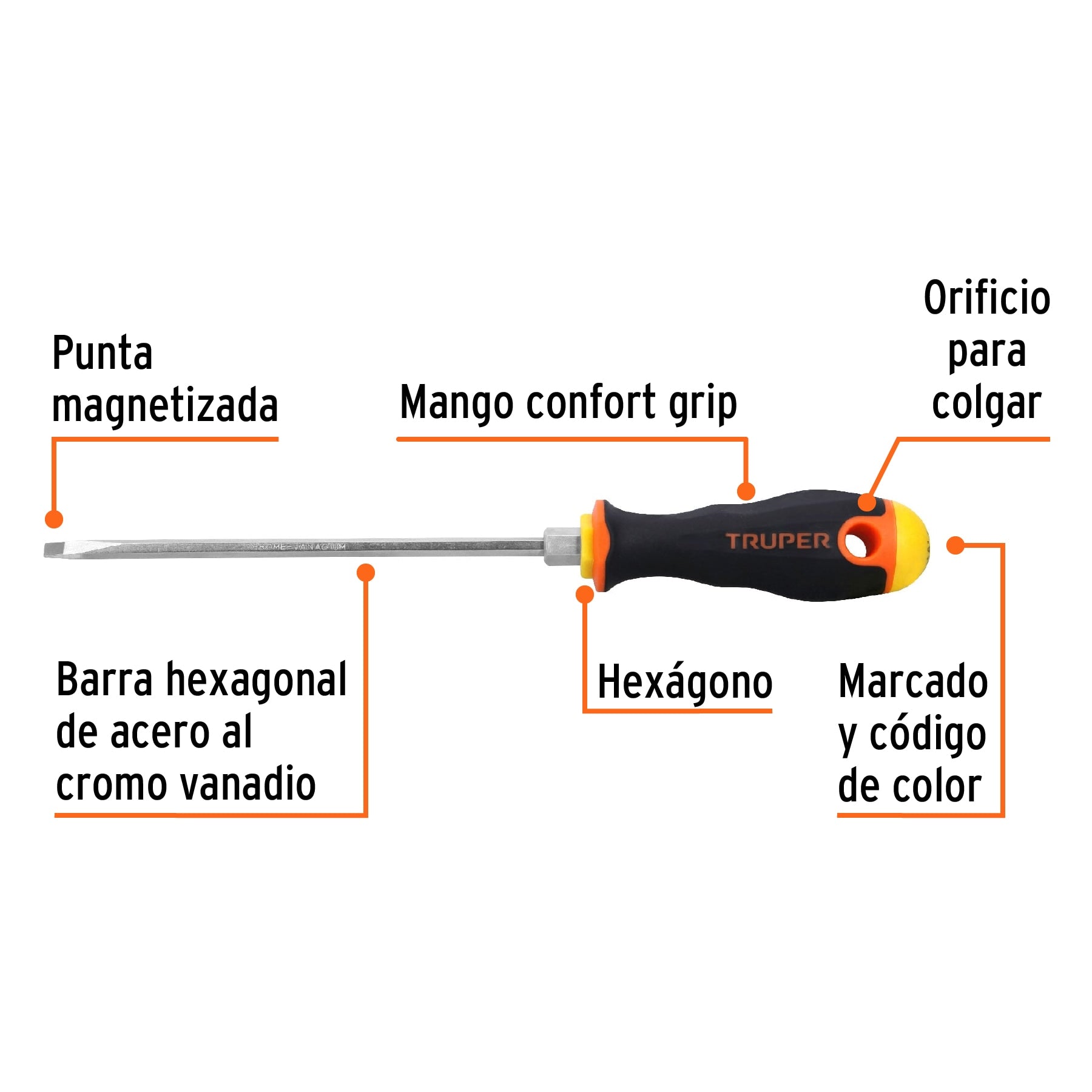 Desarmador tipo cabinet diseñado para trabajos de precisión y ajuste fino. Incorpora barra hexagonal de acero al cromo vanadio que maximiza el torque con llave, punta magnetizada y mango Comfort Grip con orificio para colgar. Incluye marcado y código de color para una rápida identificación de la medida y la punta, ideal para uso profesional continuo.