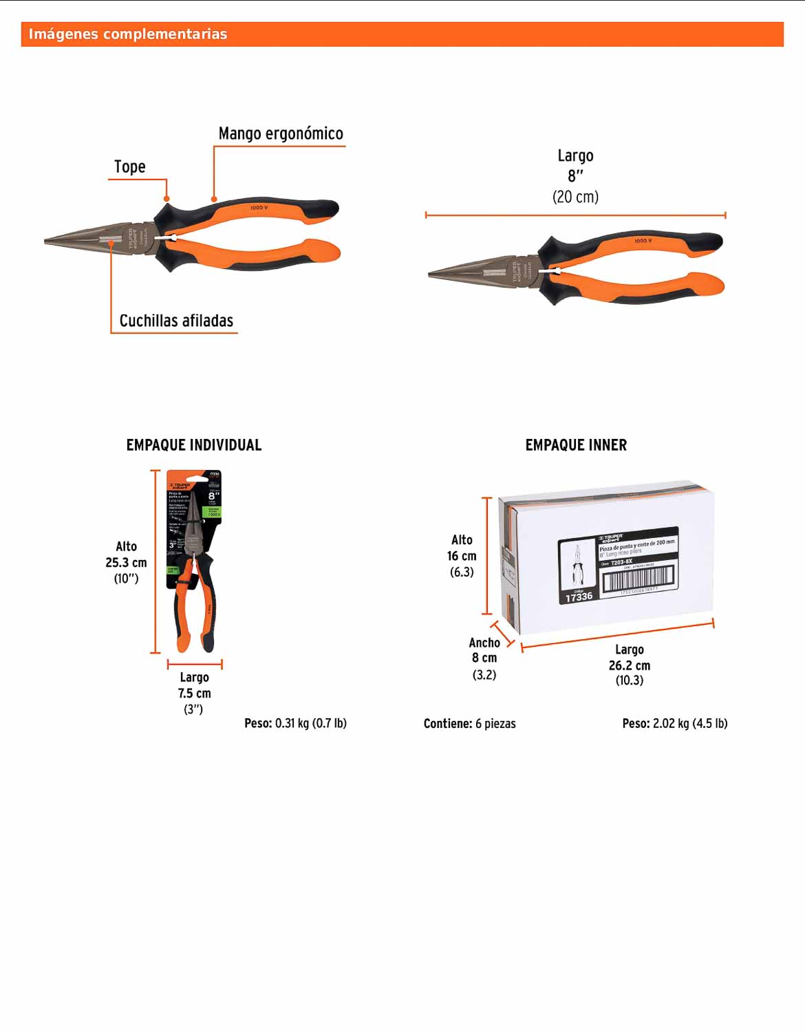 Pinza punta y corte de 8" con mango Comfort Grip, diseñada para cortes rápidos y precisos y para una sujeción firme gracias a sus mordazas con moleteado diagonal. Aísla hasta 1,000 voltios de corriente alterna y cuenta con acabado niquelado gris para mayor resistencia a la corrosión.