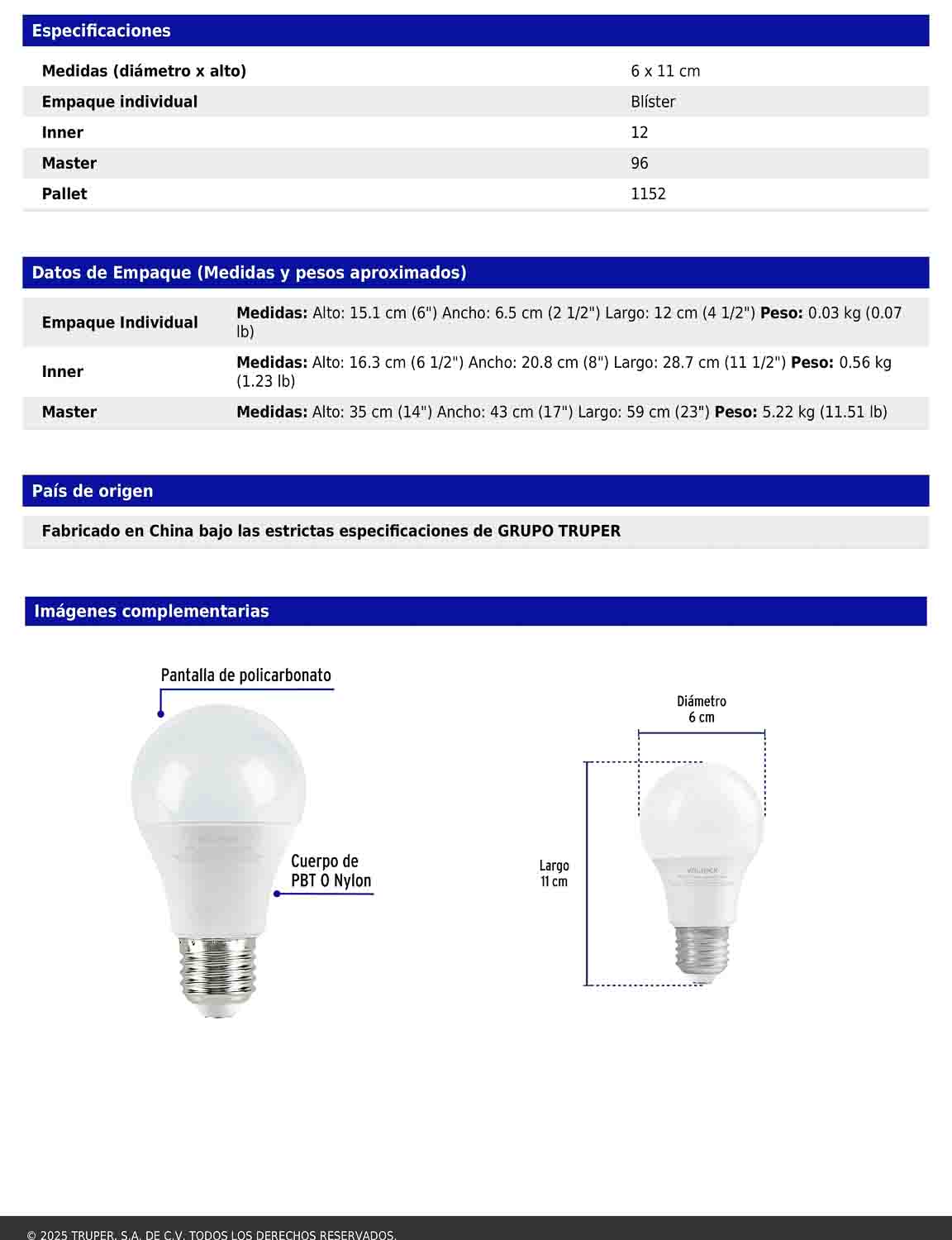 Foco LED diseñado para ofrecer iluminación eficiente con un ahorro energético de hasta 85% frente a focos incandescentes. Proporciona encendido instantáneo, luz blanca fría de 6500 K y distribución omnidireccional. Fabricado con cuerpo de PBT o nylon y pantalla de policarbonato para mayor durabilidad. No es compatible con atenuadores.