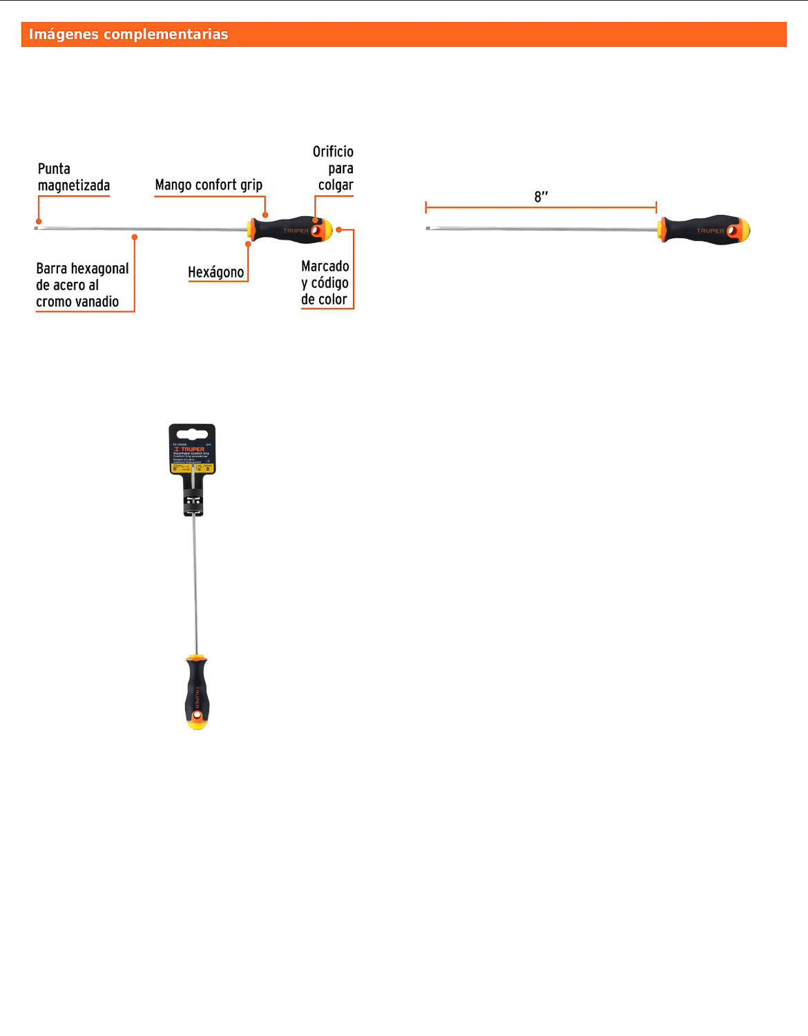 Desarmador tipo cabinet diseñado para trabajos de precisión y ajuste fino. Incorpora barra hexagonal de acero al cromo vanadio, punta magnetizada y mango Comfort Grip con orificio para colgar. Incluye marcado y código de color para una rápida identificación de la medida y la punta, ideal para uso profesional continuo.