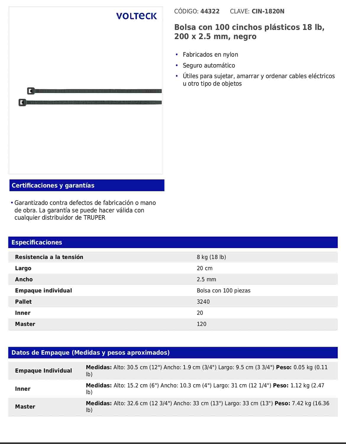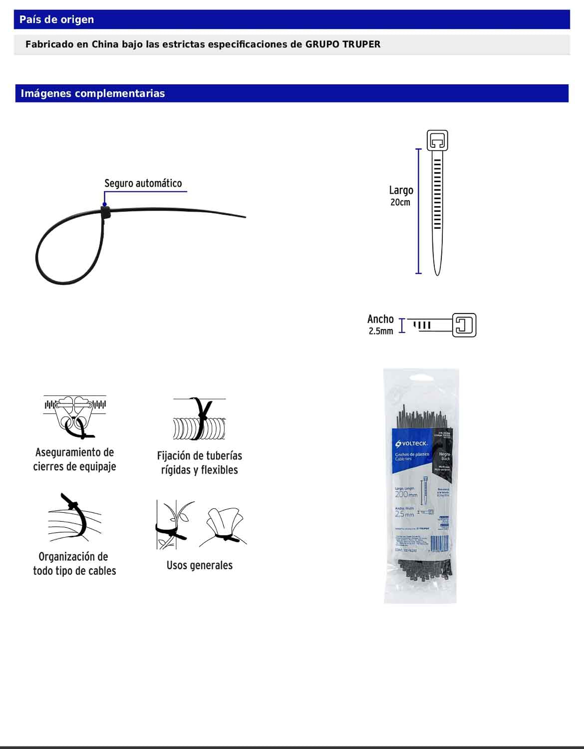 Bolsa con 100 cinchos plásticos 18 lb 200 x 2.5 mm negro
