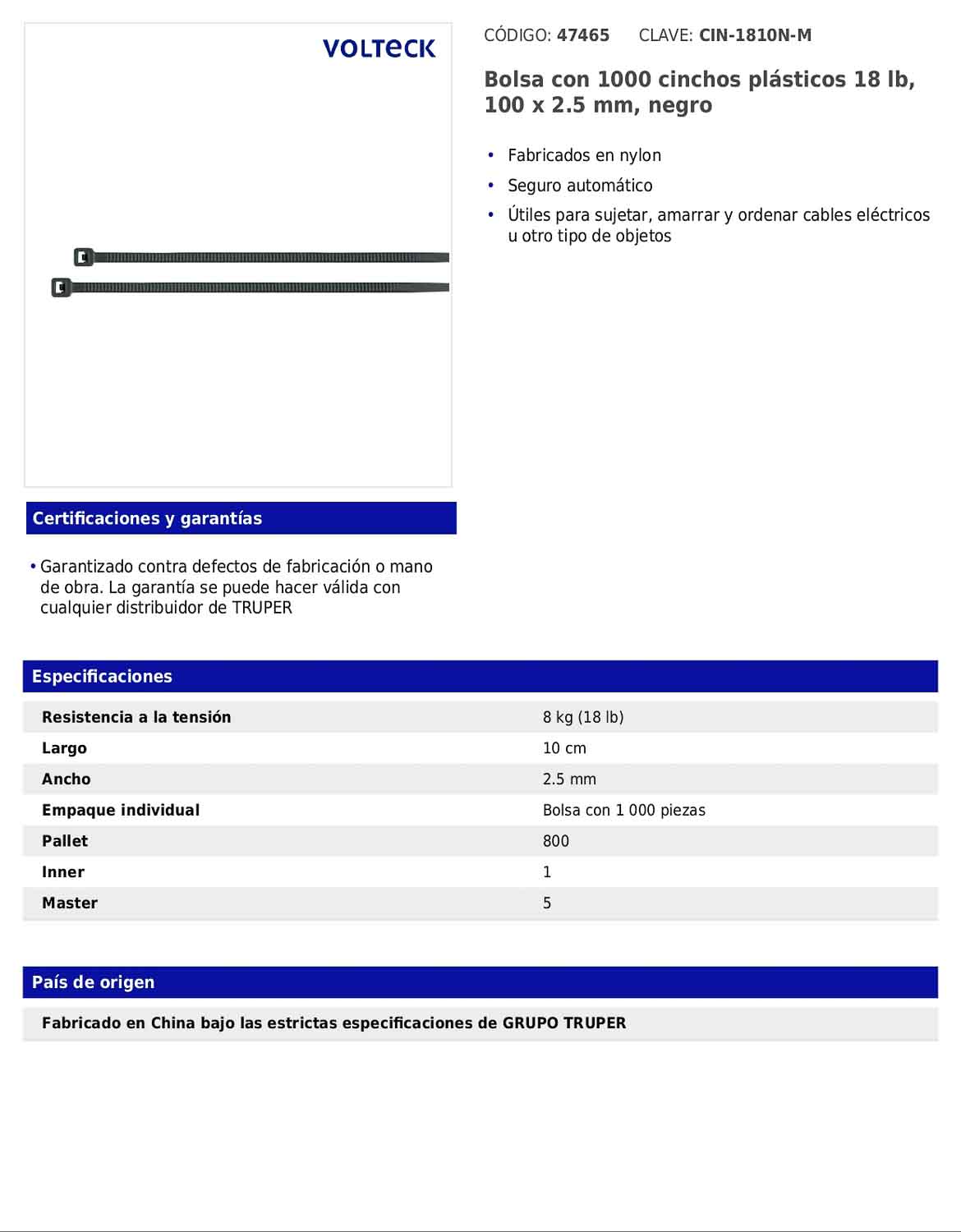 Bolsa con 1000 cinchos plásticos 18 lb de 100 x 2.5 mm negro