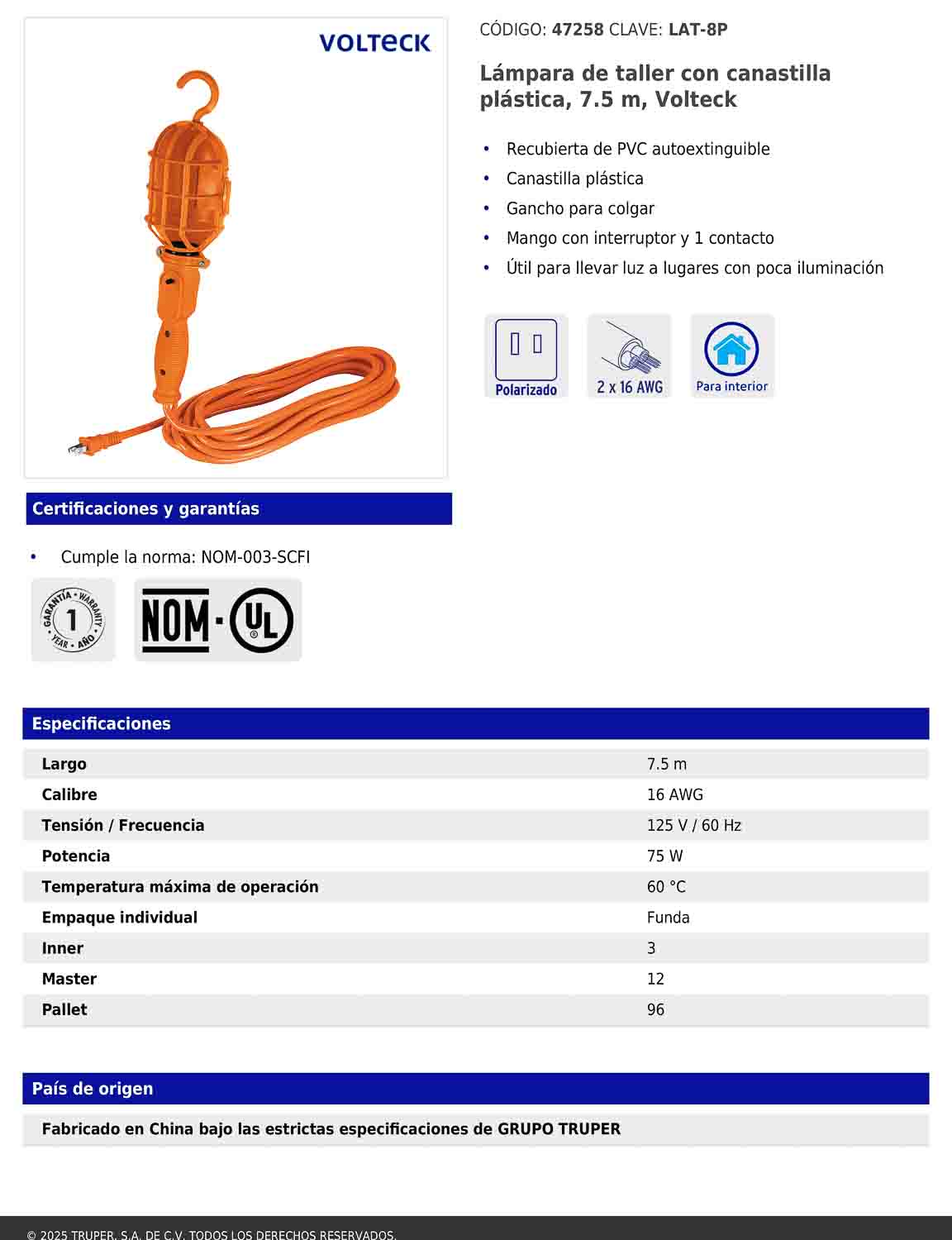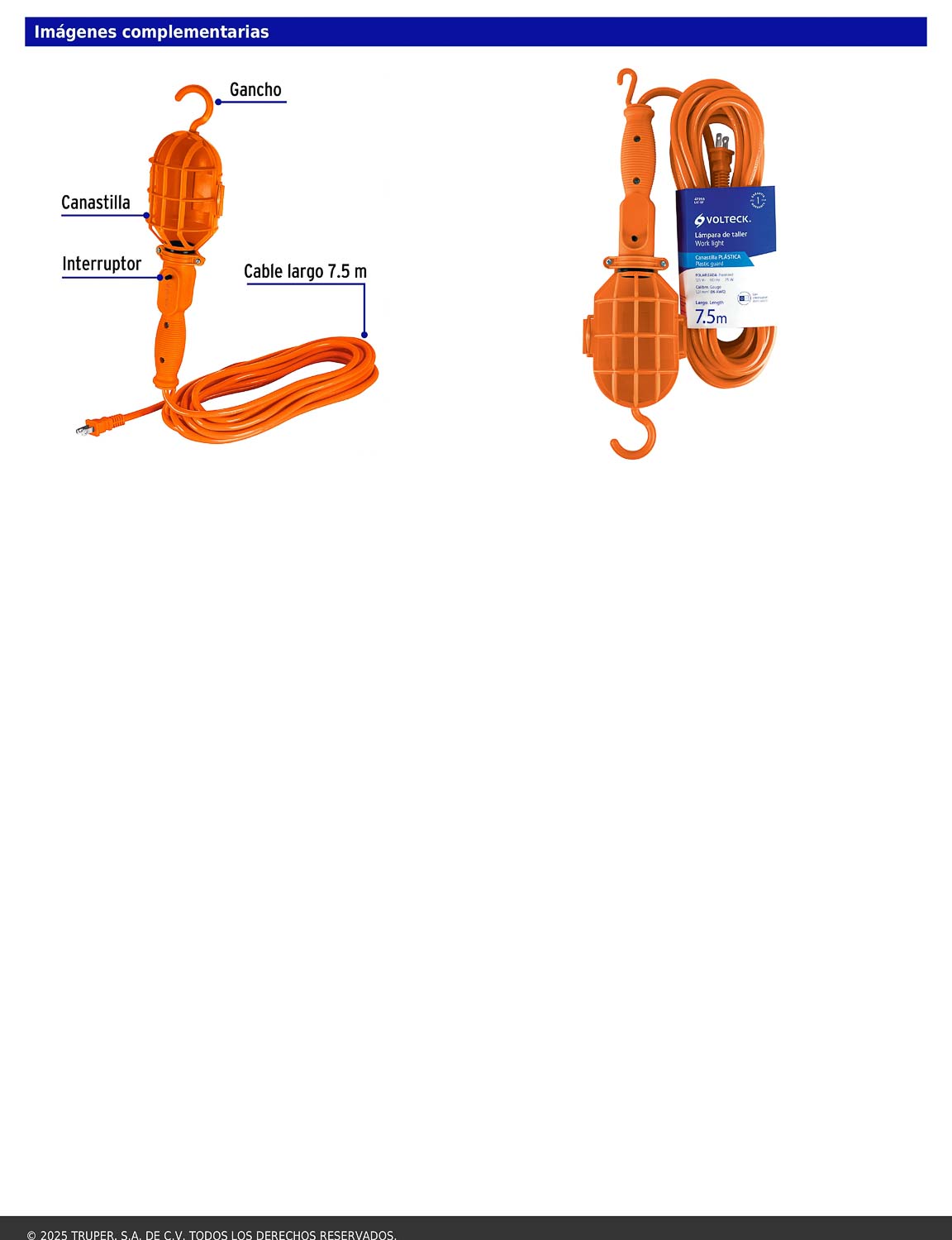 Lámpara portátil diseñada para iluminar áreas con poca luz, equipada con canastilla plástica resistente y gancho para colgar que permite posicionarla fácilmente durante trabajos de mantenimiento. Cuenta con interruptor integrado, un contacto y cable recubierto de PVC autoextinguible para mayor seguridad y durabilidad.