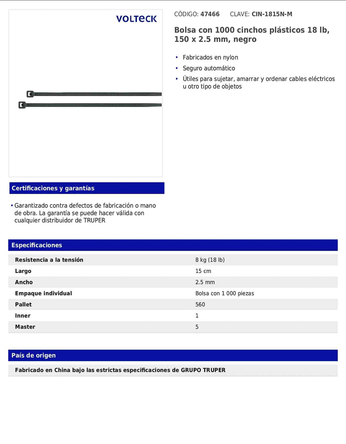 Bolsa con 1000 cinchos plásticos 18 lb de 150 x 2.5 mm negro