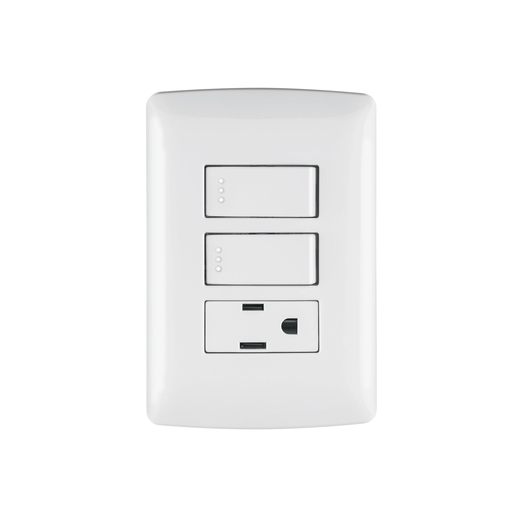 Placa armada para instalaciones eléctricas interiores que integra dos interruptores sencillos y un contacto aterrizado en un módulo triple. Es ideal para uso residencial o comercial, ya que permite controlar dos luminarias y alimentar un dispositivo eléctrico desde un mismo punto.