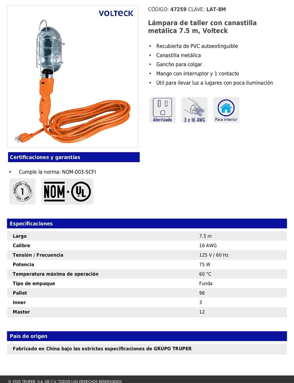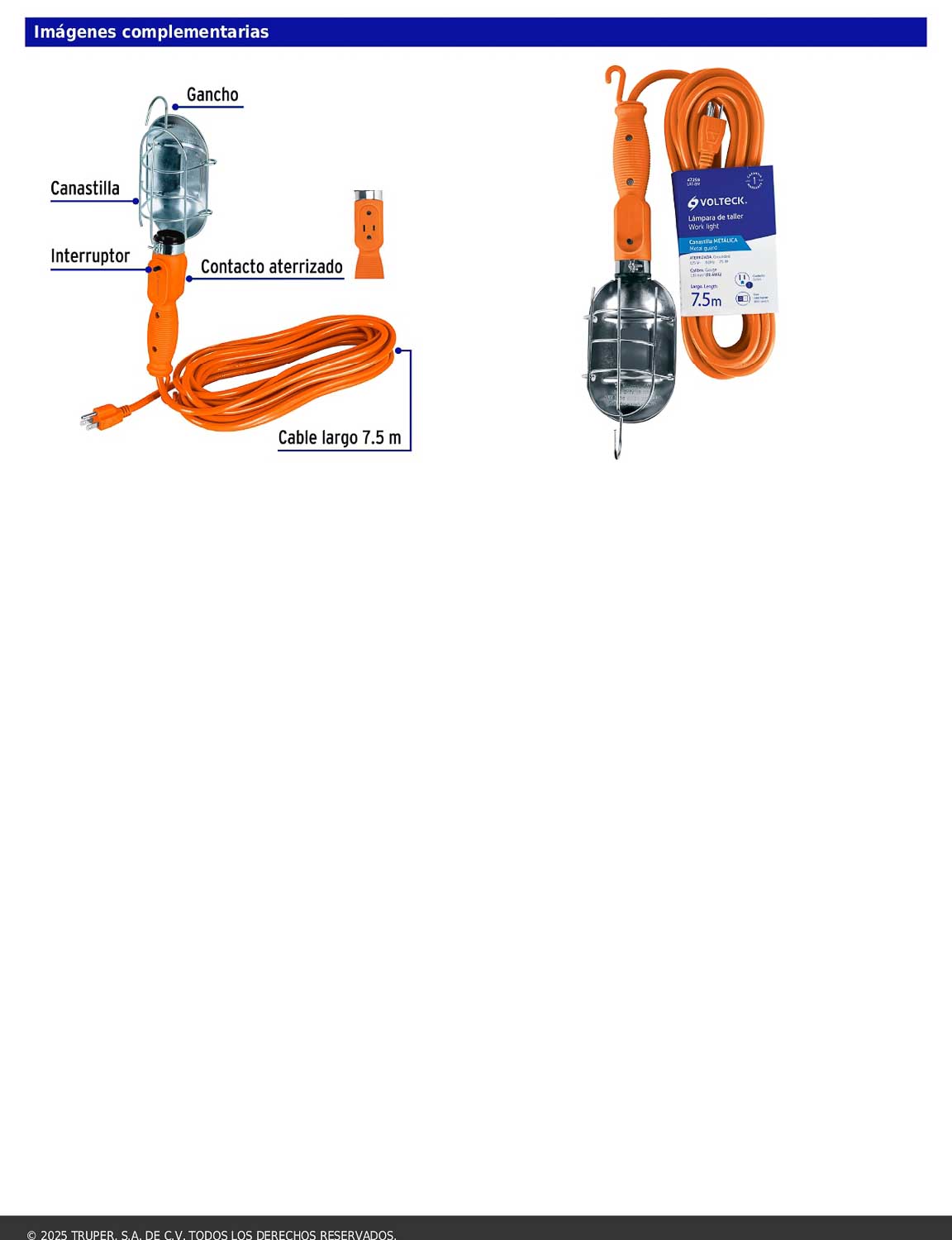 Lámpara portátil diseñada para iluminar zonas con poca visibilidad, equipada con canastilla metálica resistente y gancho para colgar que facilita su uso en áreas de mantenimiento y reparación. Incluye interruptor integrado y contacto aterrizado, además de un cable recubierto de PVC autoextinguible para mayor seguridad.