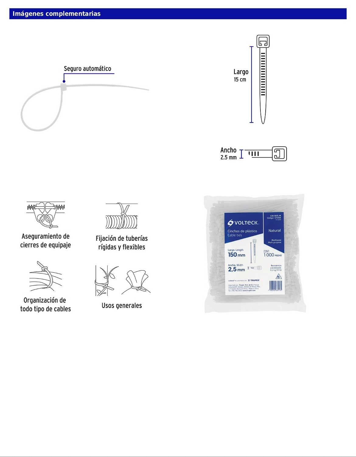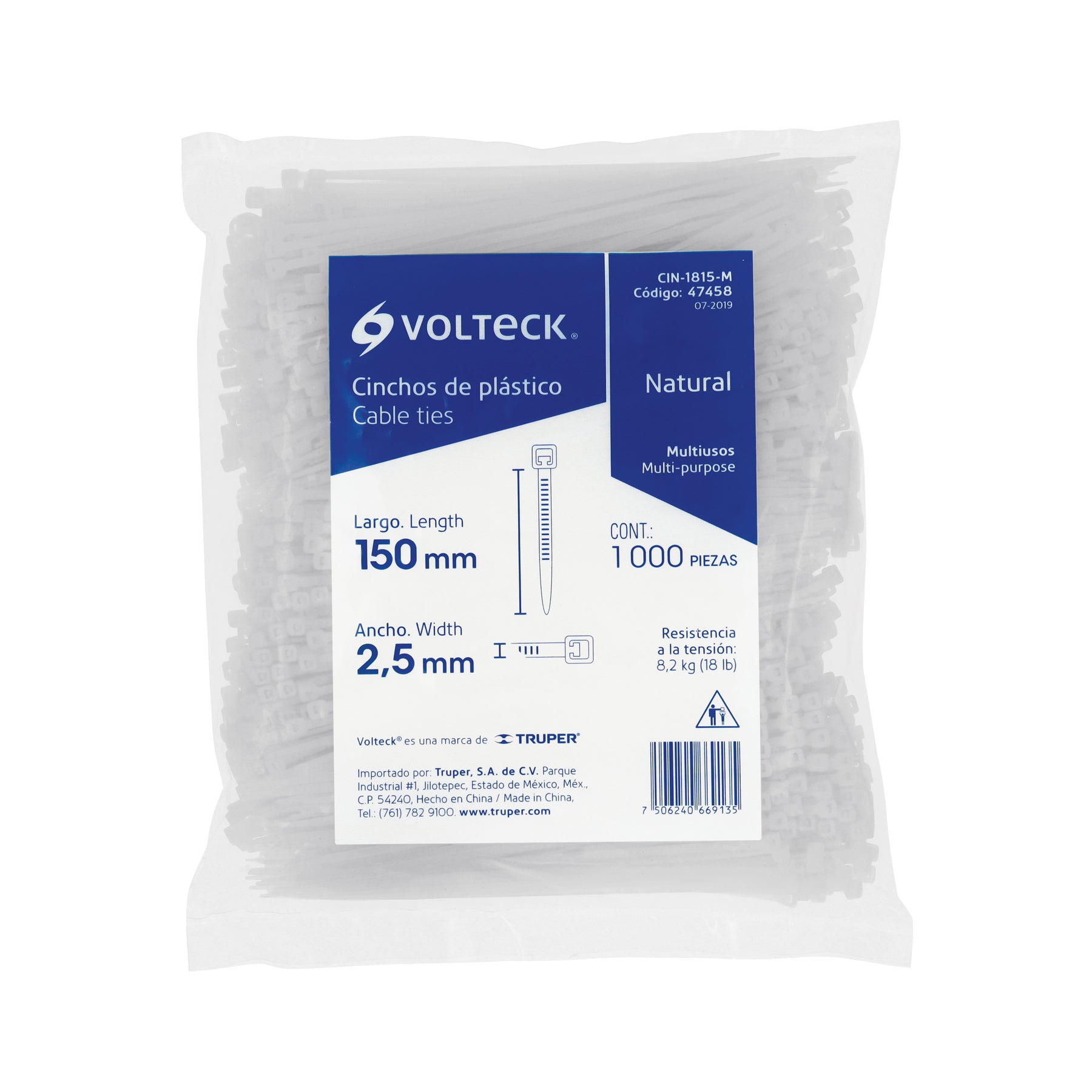 Bolsa con 1000 cinchos plásticos 18 lb de 150 x 2.5 mm natural