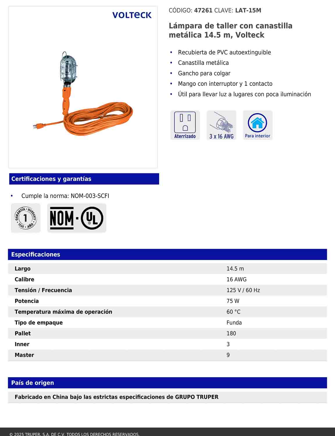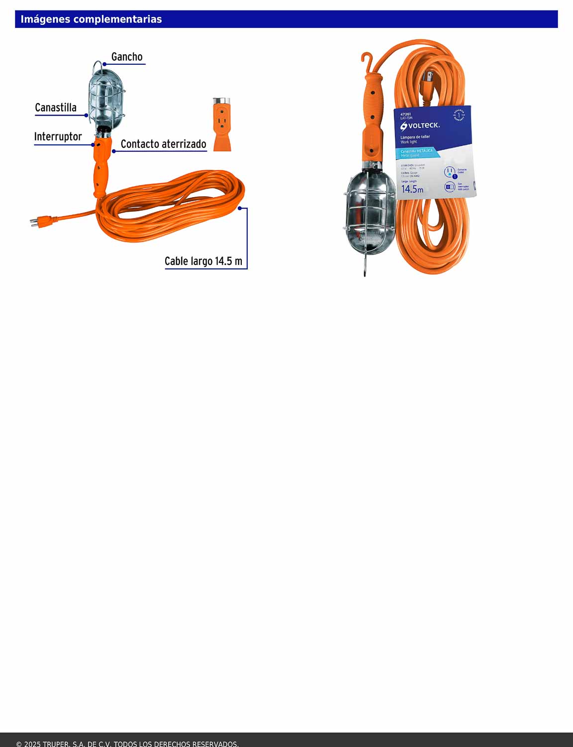 Lámpara portátil diseñada para iluminar áreas con poca luz, equipada con canastilla metálica resistente y gancho para colgar que facilita su uso en trabajos de reparación, mantenimiento o inspección. Incluye interruptor integrado y un contacto aterrizado, junto con un cable de PVC autoextinguible que mejora la seguridad durante su operación.