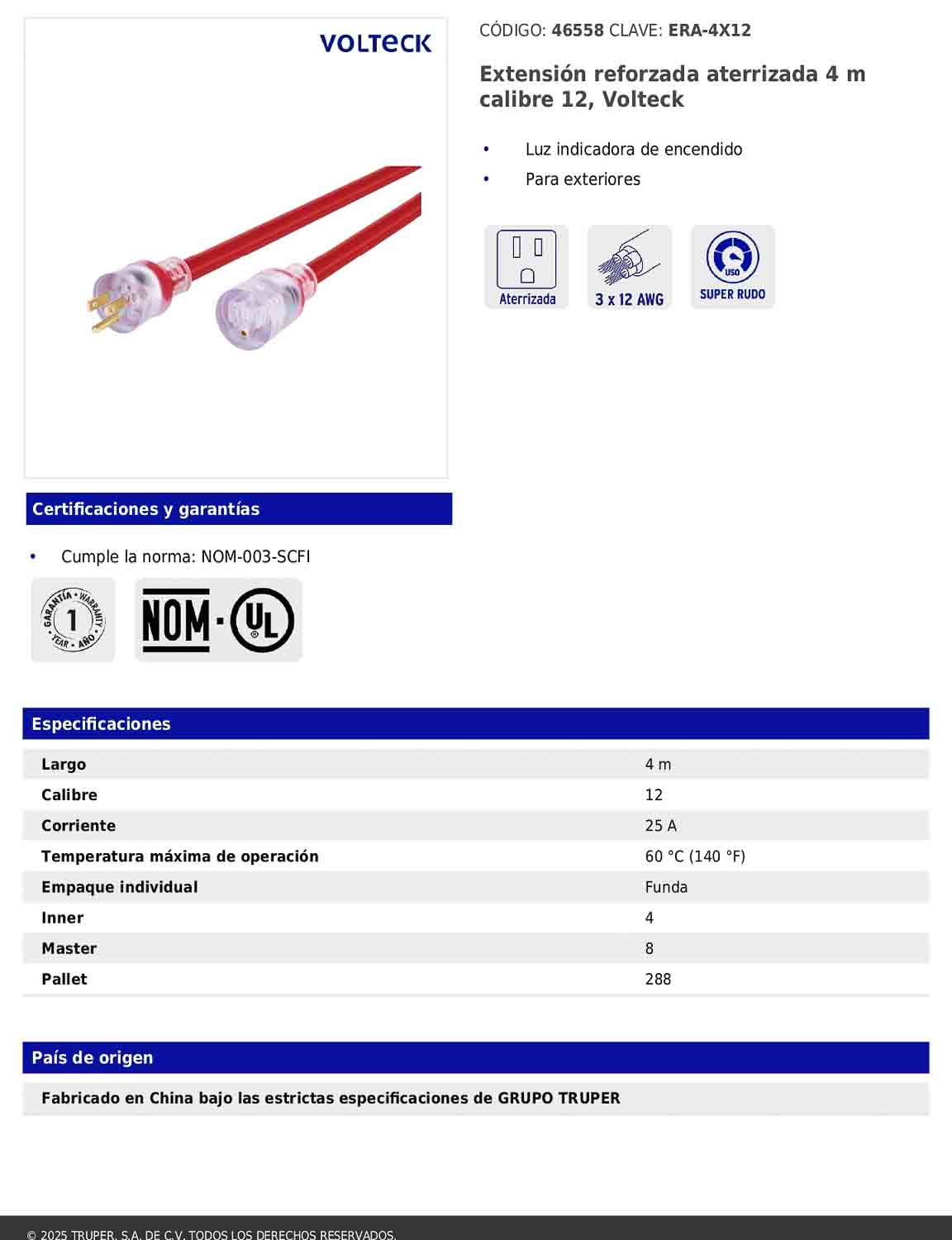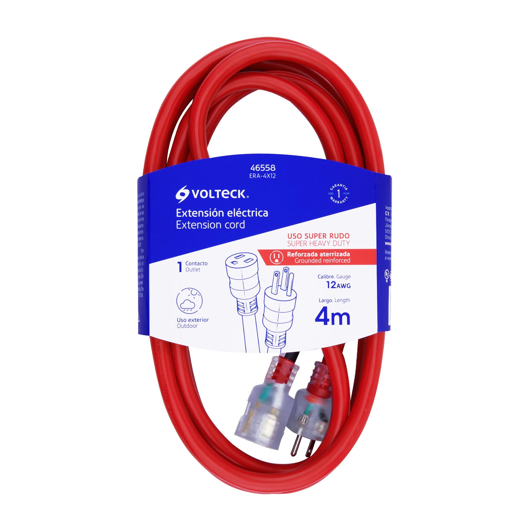 Extensión eléctrica reforzada diseñada para uso superrudo en exteriores, equipada con luz indicadora de encendido para verificar rápidamente la presencia de energía. Su construcción aterrizada ofrece mayor seguridad en la conexión y su calibre 12 permite trabajar con herramientas y equipos de alto consumo eléctrico de forma confiable.