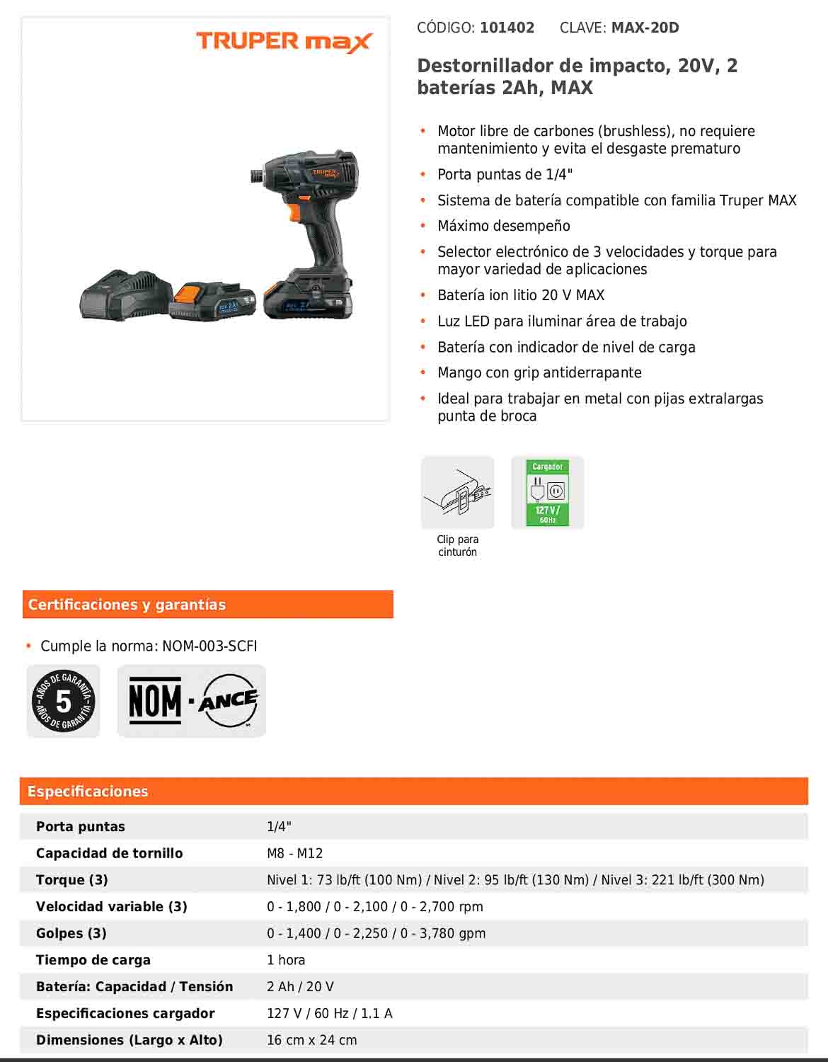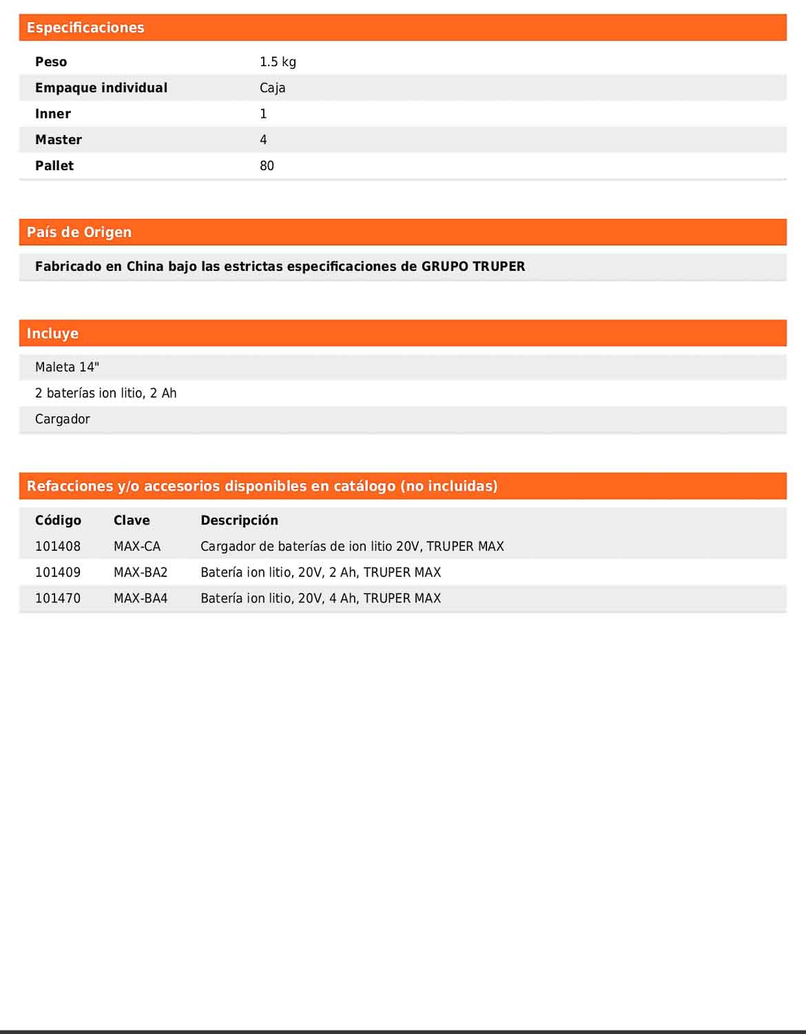 - Batería ion litio de 20 V con capacidad de 2 Ah.