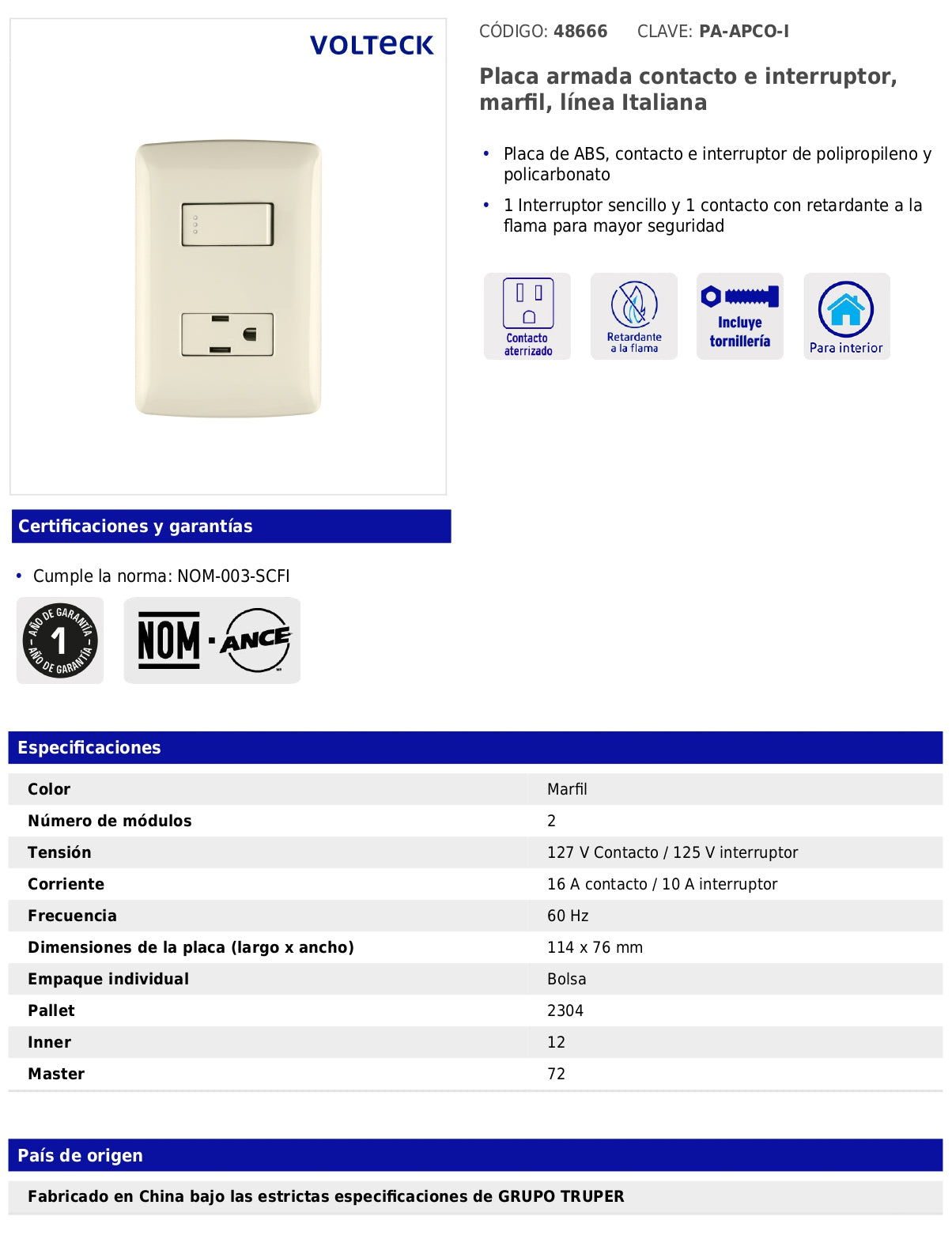 - Tensión: 127 V contacto / 125 V interruptor.