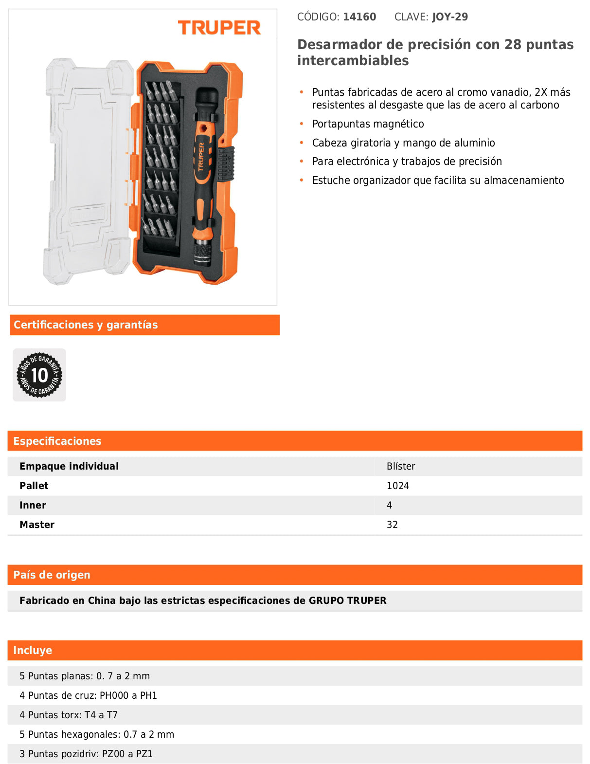 Desarmador de precisión diseñado para trabajos de electrónica y tareas detalladas, equipado con puntas fabricadas en acero al cromo vanadio que ofrecen mayor resistencia al desgaste. Incorpora portapuntas magnético, mango de aluminio con cabeza giratoria que facilita el control durante el uso y un estuche organizador que permite mantener todas las puntas ordenadas y protegidas.