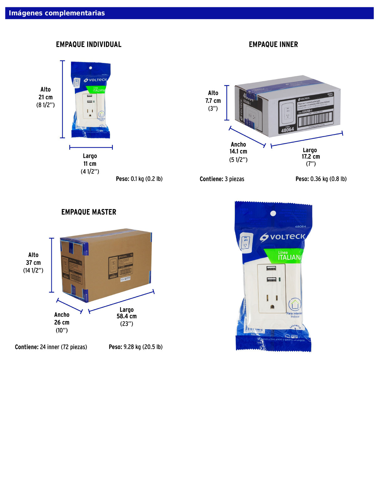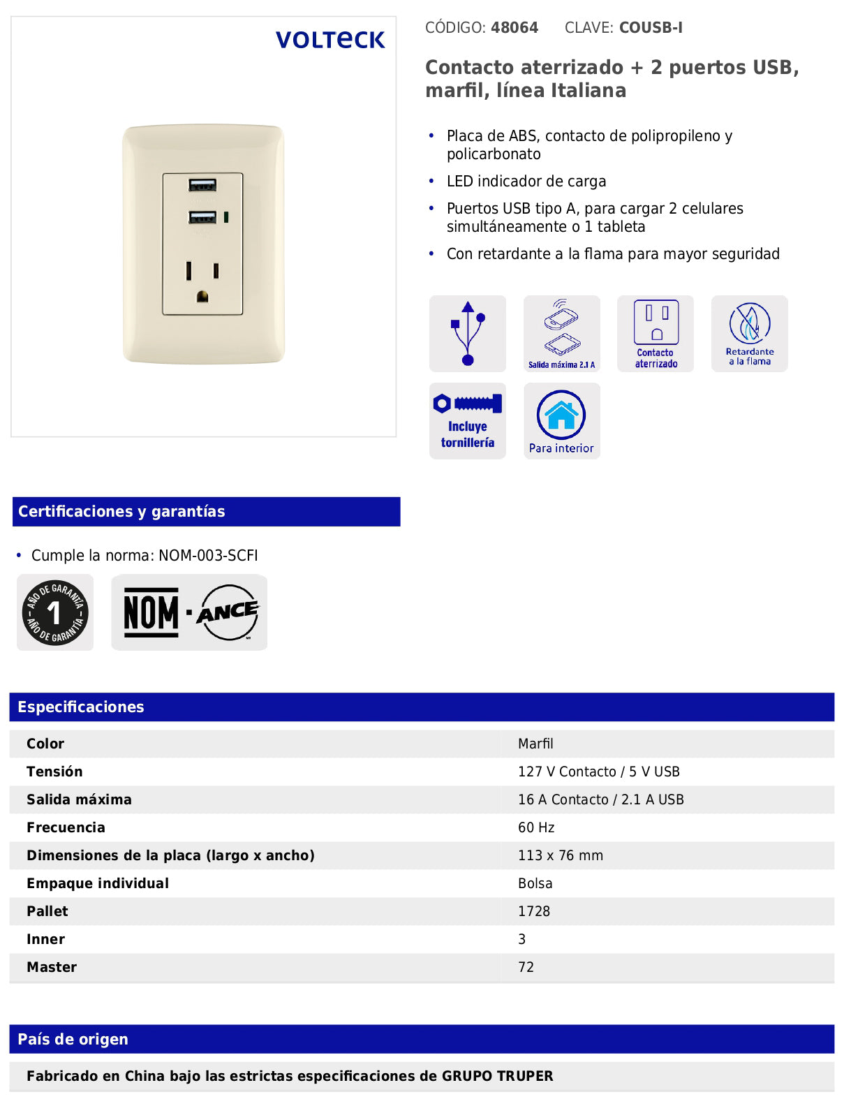 - Tensión: 127 V contacto / 5 V USB.