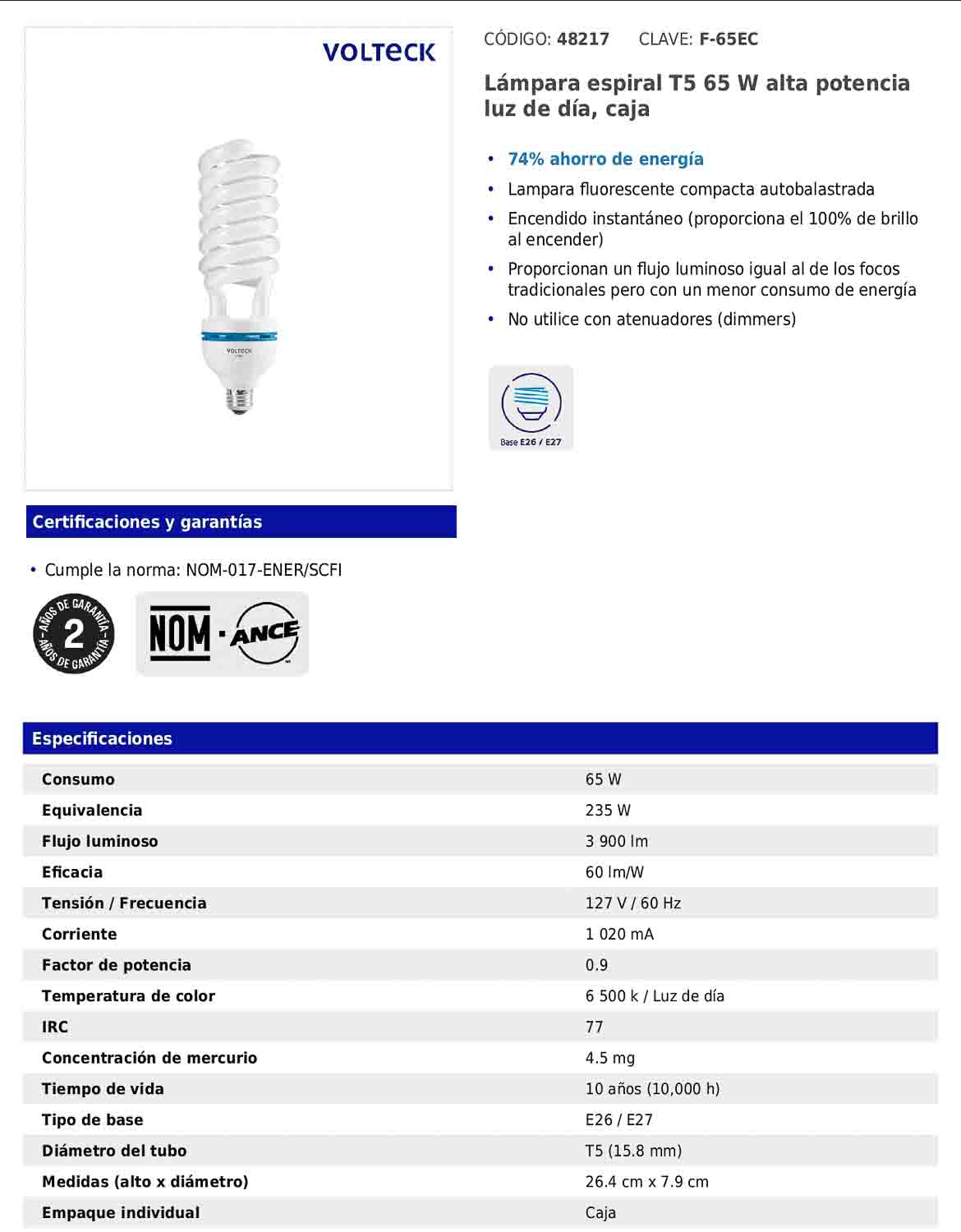 - Eficacia luminosa de 60 lm/W.
