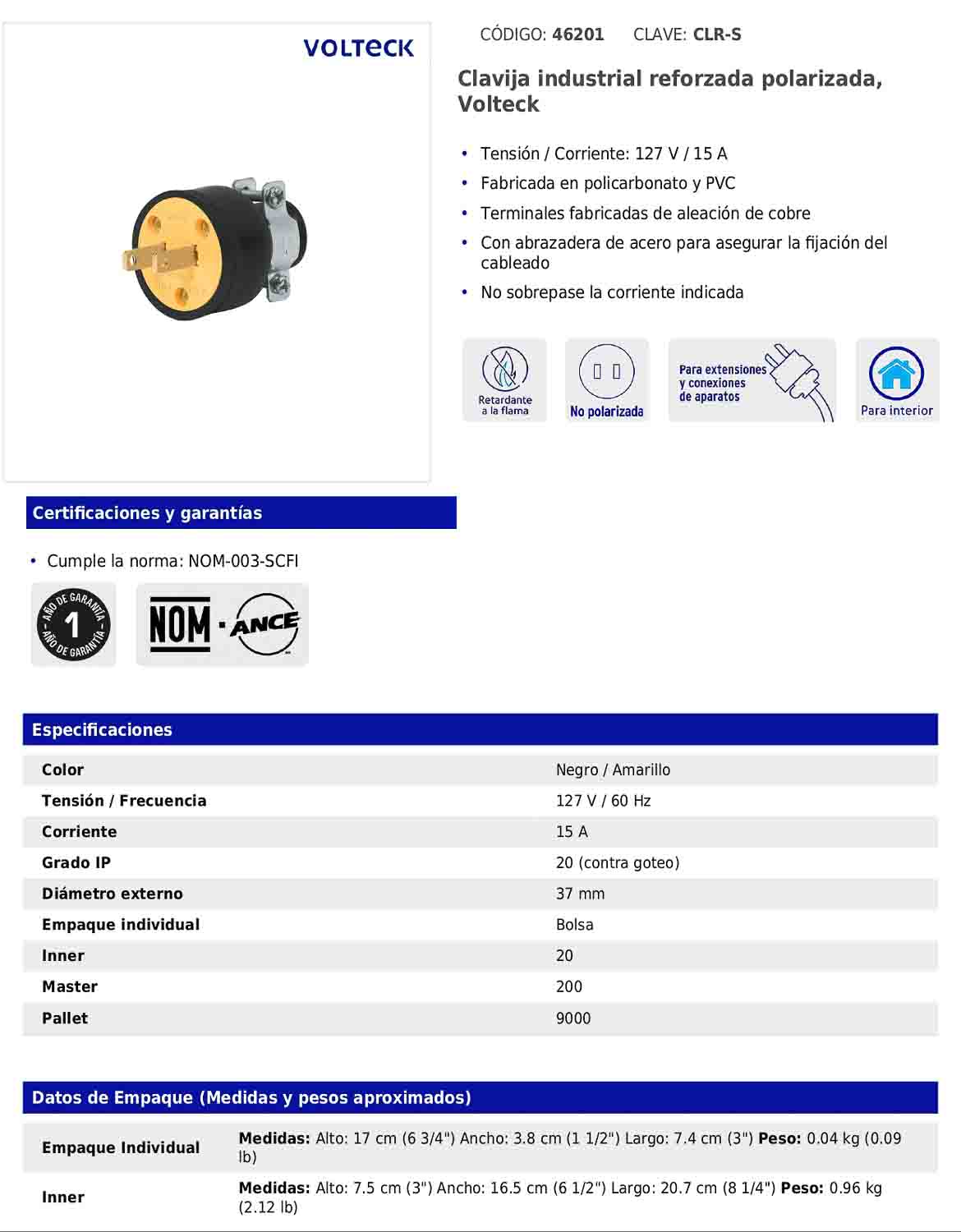 Clavija industrial reforzada polarizada fabricada en policarbonato y PVC, con terminales de aleación de cobre y abrazadera de acero para asegurar la fijación del cableado. No sobrepase la corriente indicada y cumple con la norma NOM-003-SCFI.