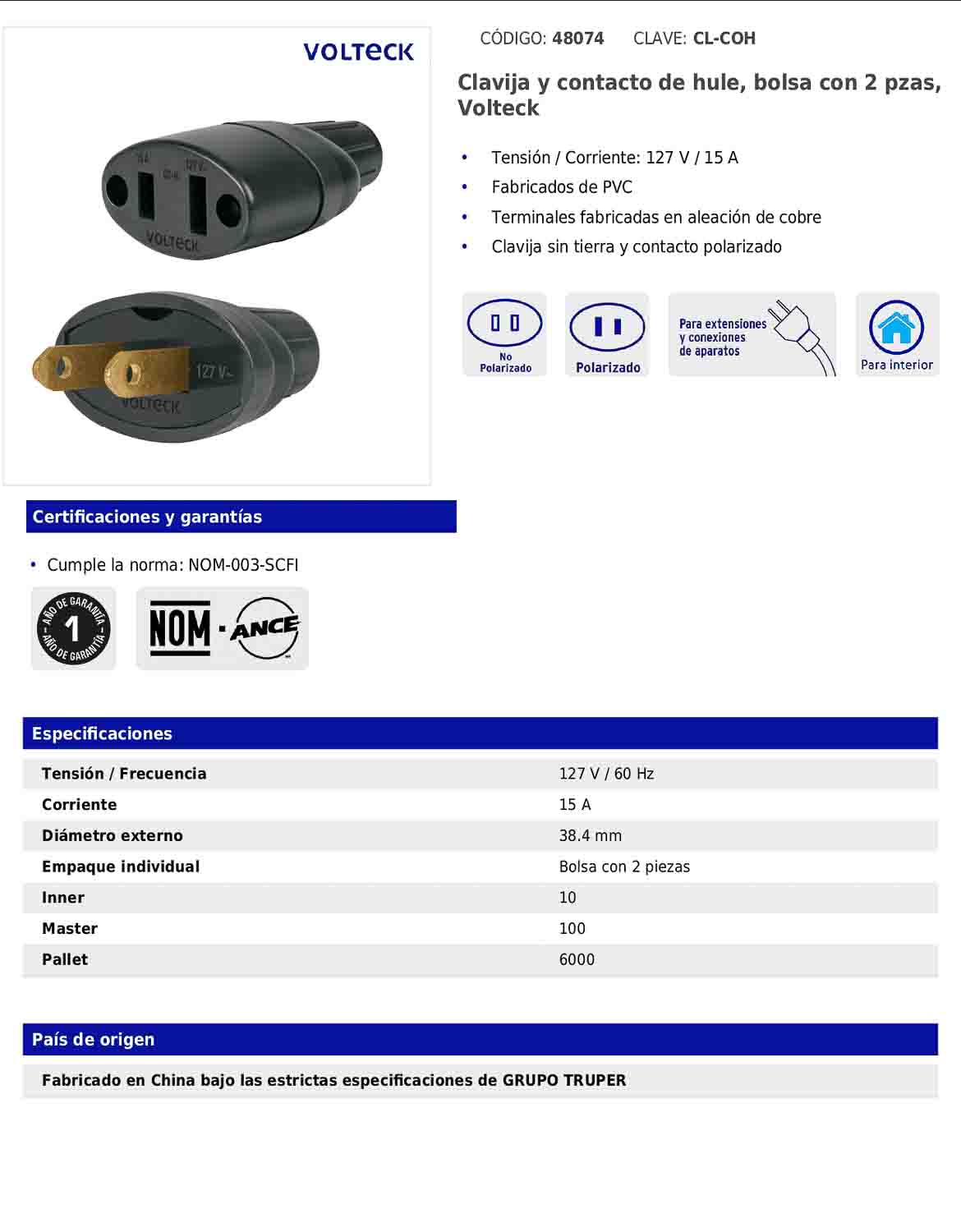 Set de clavija y contacto de hule, fabricados de PVC con terminales de aleación de cobre. Incluye clavija sin tierra y contacto polarizado. Cumple con la norma NOM-003-SCFI.