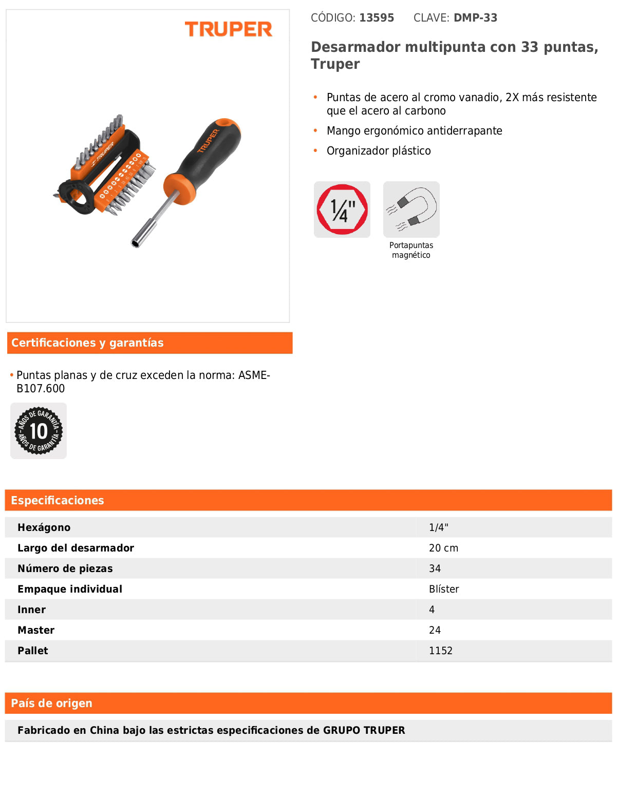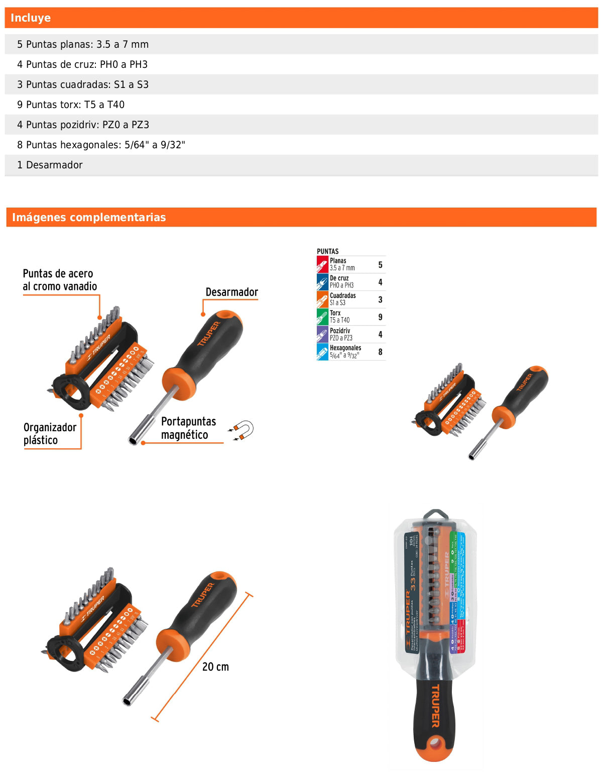 Cuenta con mango ergonómico antiderrapante que brinda un agarre cómodo y seguro, además de portapuntas magnético que facilita el cambio rápido de puntas. El organizador plástico permite mantener todas las piezas ordenadas y listas para su uso.