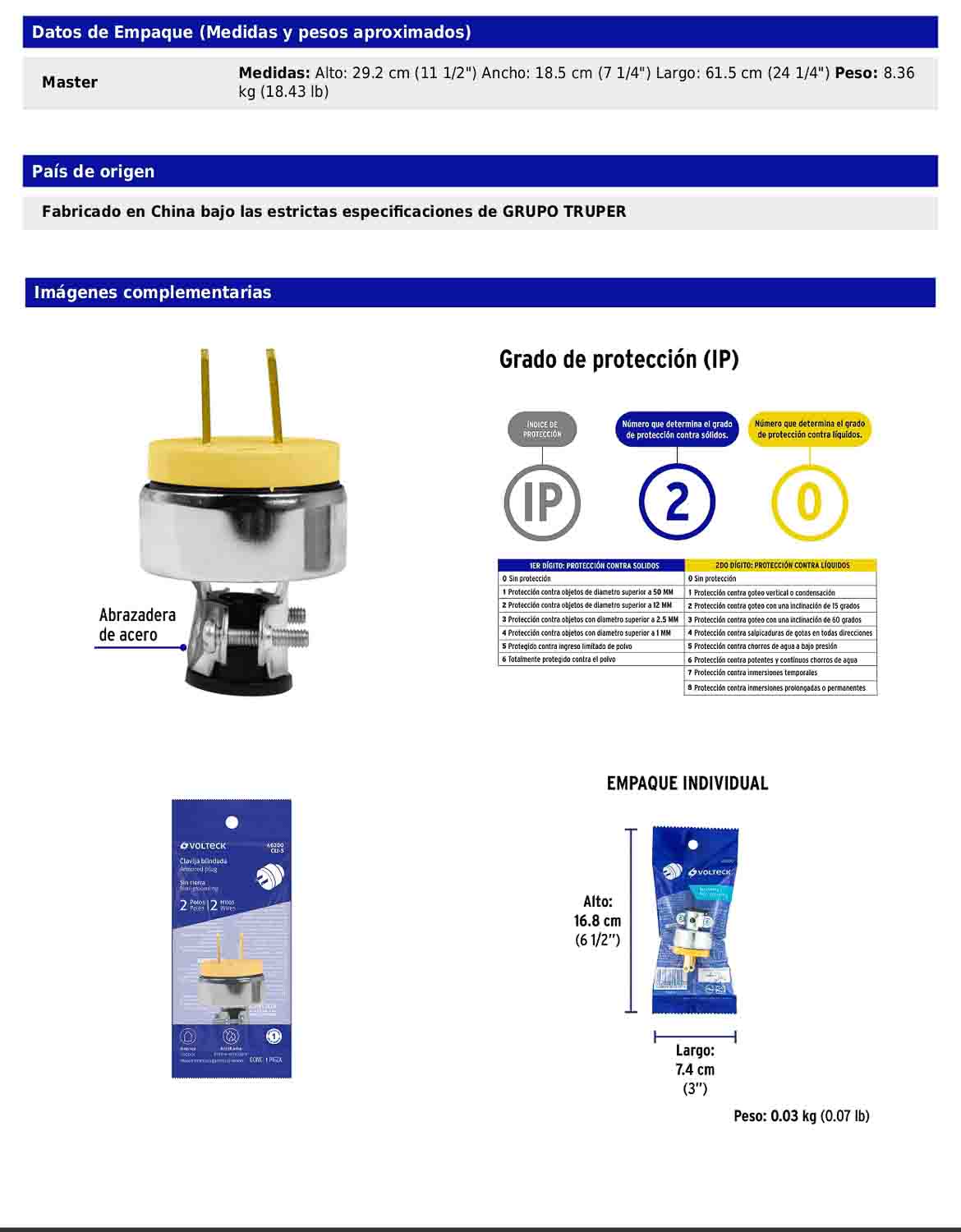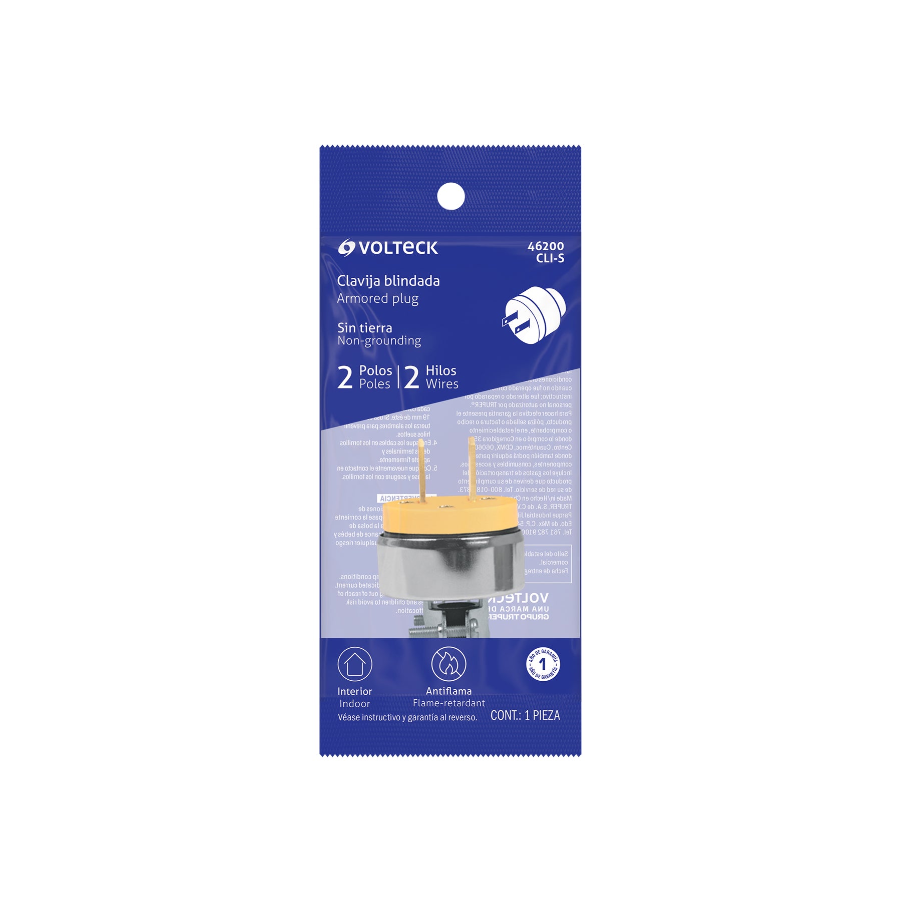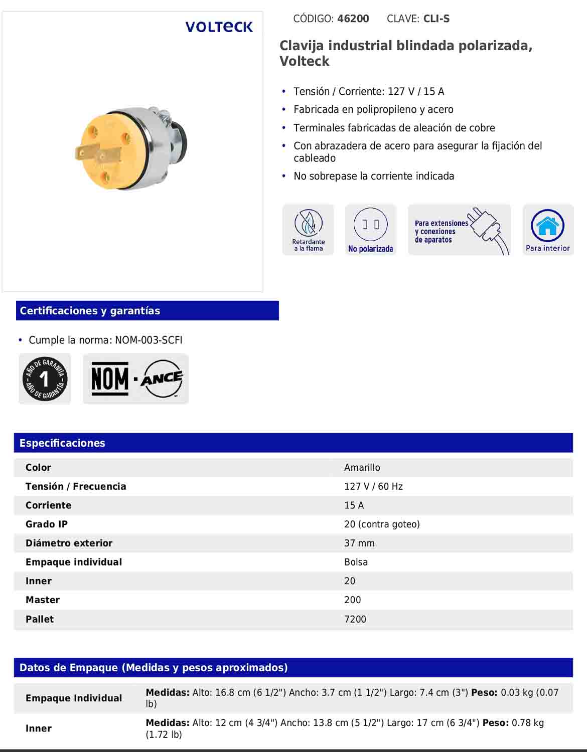Clavija industrial blindada polarizada fabricada en polipropileno y acero, con terminales de aleación de cobre. Incorpora abrazadera de acero para asegurar la fijación del cableado. Cumple con la norma NOM-003-SCFI.